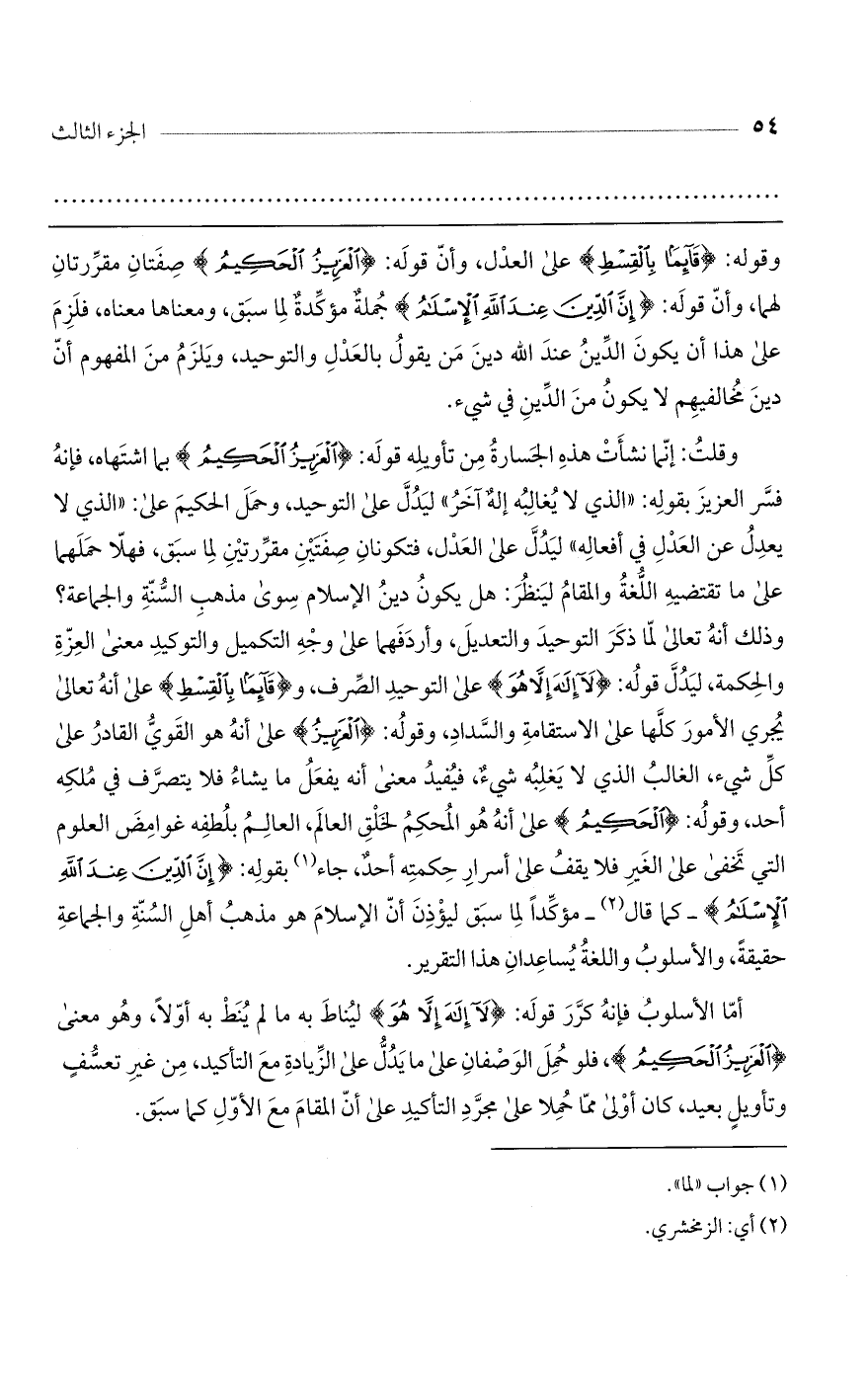 وقلت: إنما نشأت هذه الجسارة من تأويله قوله: (الْعَزِيزُ الْحَكِيمُ) بما اشتهاه، فإنه فسر العزيز بقوله: "الذي لا يغالبه إله آخر" ليدل على التوحيد، وحمل الحكيم على: "الذي لا يعدل عن العدل في أفعاله" ليدل على العدل، فتكونان صفتين مقررتين لما سبق، فهلا حملهما على ما تقتضيه اللغة والمقام لينظر: هل يكون دين الإسلام سوى مذهب السنة والجماعة؟ وذلك أنه تعالى لما ذكر التوحيد والتعديل، وأردفهما على وجه التكميل والتوكيد معنى العزة والحكمة، ليدل قوله: (لا إِلَهَ إِلاَّ هُوَ) على التوحيد الصرف، و (قَائِماً بِالْقِسْطِ) على أنه تعالى يجري الأمور كلها على الاستقامة والسداد، وقوله: (الْعَزِيزُ) على أنه هو القوي القادر على كل شيء، الغالب الذي لا يغلبه شيء، فيفيد معنى أنه يفعل ما يشاء فلا يتصرف في ملكه أحد، وقوله: (الْحَكِيمِ) على أنه هو المحكم لخلق العالم، العالم بلطفه غوامض العلوم التي تخفى على الغير فلا يقف على أسرار حكمته أحد، جاء بقوله: (إِنَّ الدِّينَ عِنْدَ اللَّهِ الإِسْلامُ) ـ كما قالـ مؤكداً لما سبق ليؤذن أن الإسلام هو مذهب أهلا لسنة والجماعة حقيقة، والأسلوب واللغة يساعدان هذا التقرير.