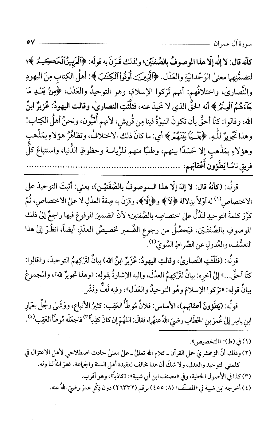 قوله: (كأنه قال: لا إله إلا هذا الموصوف بالصفتين)، يعني: أثبت التوحيد على الاختصاص له أولاً بدلالة (لَا) و (إِلَّا)، وقرن به صفة العدل لا على الاختصاص، ثم كرر كلمة التوحيد لتدل على اختصاصه بالصفتين؛ لأن الضمير المرفوع فيها راجع إلى ذلك الموصوف بالصفتين، فيحصل من رجوع الضمير تخصيص العدل أيضاً، انظر إلى هذا التعسف، والعدول عن الصراط السوي.
