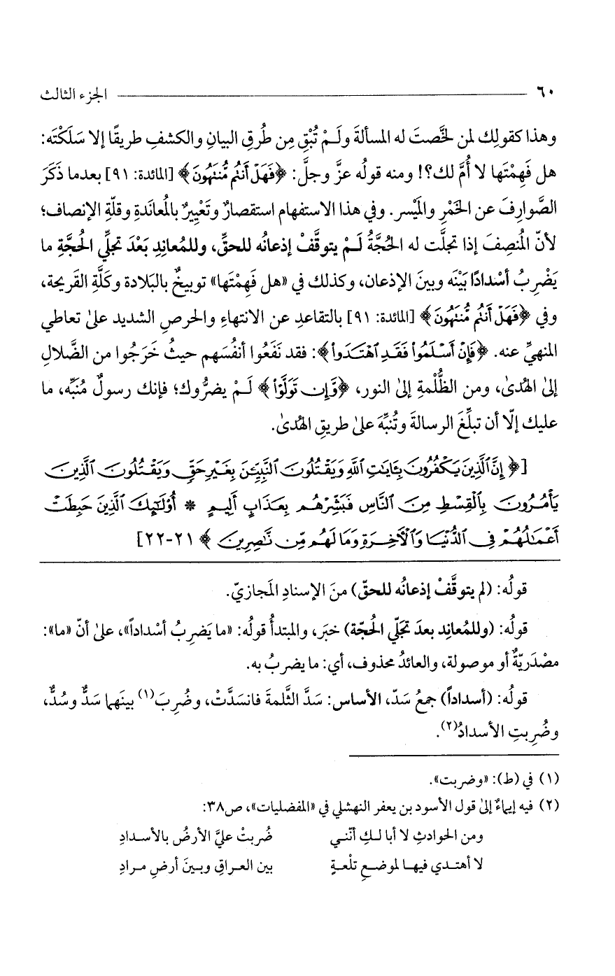 وهذا كقولك لمن لخصت له المسألة ولم تبق من طرق البيان والكشف طريقاً إلا سلكته: هل فهمتها لا أم لك؟ ! ومنه قوله عزّ وجل: (فَهَلْ أَنْتُمْ مُنْتَهُونَ) [المائدة: 91] بعد ما ذكر الصوارف عن الخمر والميسر. وفي هذا الاستفهام استقصار وتعيير بالمعاندة وقلة الإنصاف؛ لأن المنصف إذا تجلت له الحجة لم يتوقف إذعانه للحق، وللمعاند بعد تجلى الحجة ما يضرب أسداداً بينه وبين الإذعان، وكذلك في: (هل فهمتها) توبيخ بالبلادة وكلة القريحة، وفي: (فَهَلْ أَنْتُمْ مُنْتَهُونَ) [المائدة: 91] بالتقاعد عن الانتهاء والحرص الشديد على تعاطي المنهي عنه (فَإِنْ أَسْلَمُوا فَقَدِ اهْتَدَوْا): فقد نفعوا أنفسهم حيث خرجوا من الضلال إلى الهدى ومن الظلمة إلى النور، (وَإِنْ تَوَلَّوْا) لم يضروك؛ فإنك رسول منبه، ما عليك إلا أن تبلغ الرسالة وتنبه على طريق الهدى.