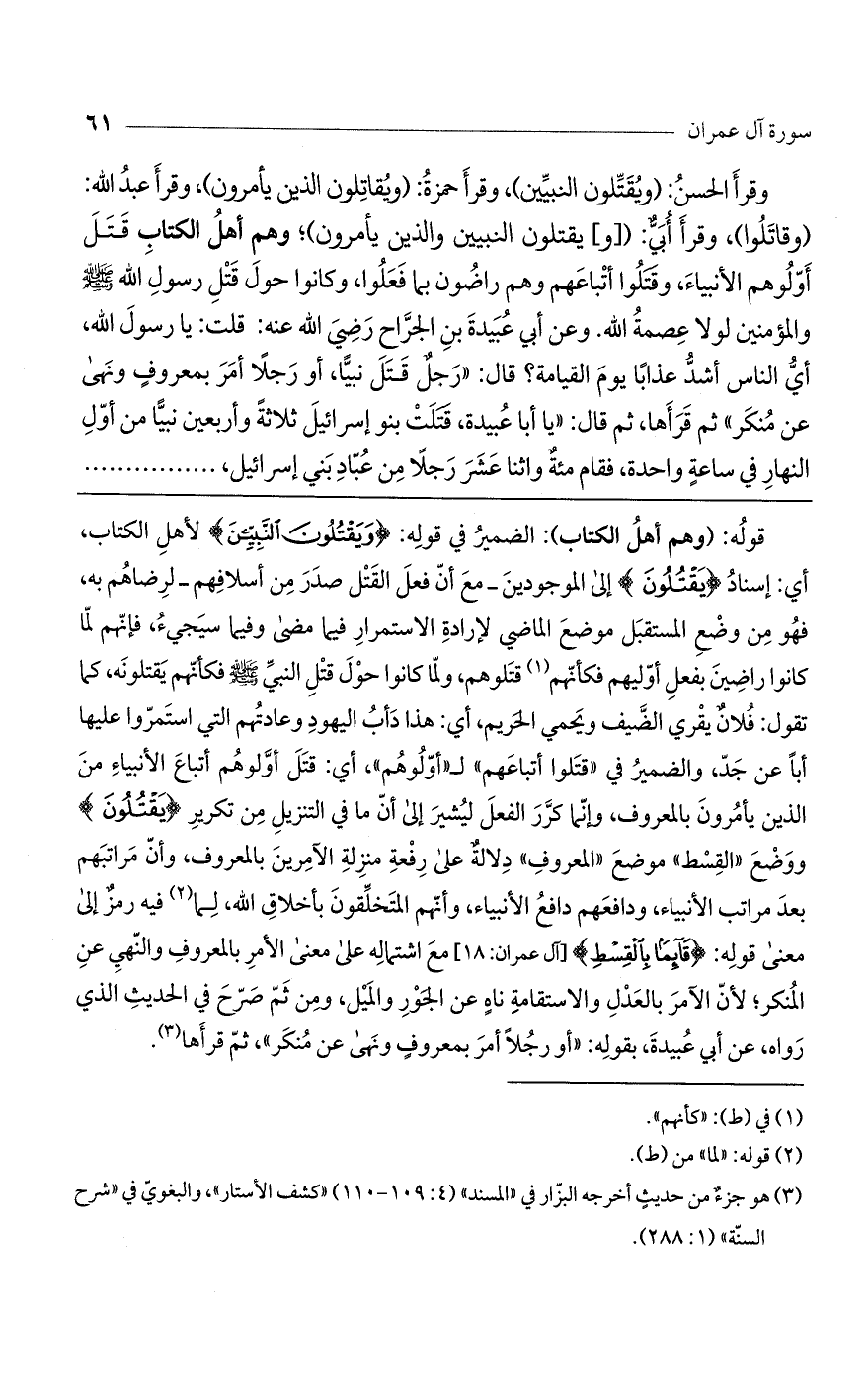 وقرأ الحسن: (ويقتلون النبيين)، وقرأ حمزة: (ويقاتلون الذين يأمرون)، وقرأ عبد اللَّه: (وقاتلوا) وقرأ أبيّ: ([و] يقتلون النبيين، والذين يأمرون)؛ وهم أهل الكتاب قتل أولوهم الأنبياء، وقتلوا أتباعهم وهم راضون بما فعلوا، وكانوا حول قتل رسول اللَّه صلى اللَّه عليه وسلم والمؤمنين لولا عصمة اللَّه. وعن أبي عبيدة بن الجراح رضي الله عنه: قلت يا رسول اللَّه، أي الناس أشدّ عذابا يوم القيامة؟ قال: "رجل قتل نبياً، أو رجلاً أمر بمعروف ونهى عن منكر" ثم قرأها، ثم قال: "يا أبا عبيدة، قتلت بنو إسرائيل ثلاثة وأربعين نبياً من أول النهار في ساعة واحدة، فقام مئة واثنا عشر رجلاً من عباد بني إسرائيل،