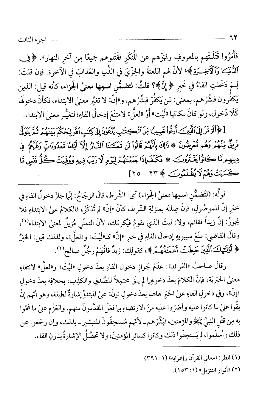 وقال صاحب "الفرائد": عدم جواز دخول الفاء بعد دخول "ليت" و"لعل" لانتفاء معنى الخبرية، فإن الكلام بعد دخولهما لم يبق محتملاً للصدق والكذب، بخلافه بعد دخول "إن"، وفي دخول الفاء على الخبر ها هنا بعد دخول "إن" على المبتدأ إشارة لطيفة، وهو أنهم إن بقوا على ما كانوا عليه وأصروا عليه من الارتضاء بما فعل المقدمون منهم، والعزم على ما هموا به من قتل النبي صلى الله عليه وسلم والمؤمنين، فبشرهمـ لأنهم مستحقون للتبشيرـ بذلك، وإن رجعوا عن ذلك وأسلموا، لم يستحقوا ذلك وكانوا كسائر المؤمنين، ولا تحصل الإشارة بدون الفاء.