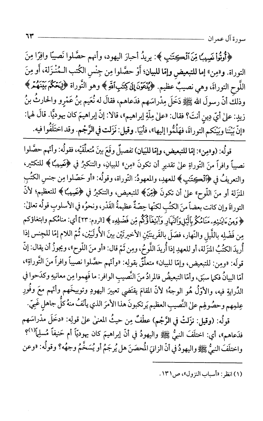 (أُوتُوا نَصِيباً مِنَ الْكِتابِ): يريد أحبار اليهود، وأنهم حصلوا نصيبا وافراً من التوراة. و"من" إما للتبعيض وإما للبيان؛ أو حصلوا من جنس الكتب المنزلة أو من اللوح التوراة، وهي نصيب عظيم (يُدْعَوْنَ إِلى كِتابِ اللَّهِ) وهو التوراة (لِيَحْكُمَ بَيْنَهُمْ) وذلك أنّ رسول اللَّه صلى اللَّه عليه وسلم دخل مدارسهم فدعاهم، فقال له نعيم بن عمرو والحارث بن زيد: على أي دين أنت؟ فقال: "على ملة إبراهيم"، قالا: إنّ إبراهيم كان يهودياً، قال لهما: "إنّ بيننا وبينكم التوراة، فهلموا إليها" فأبيا، وقيل نزلت في الرجم، وقد اختلفوا فيه ....