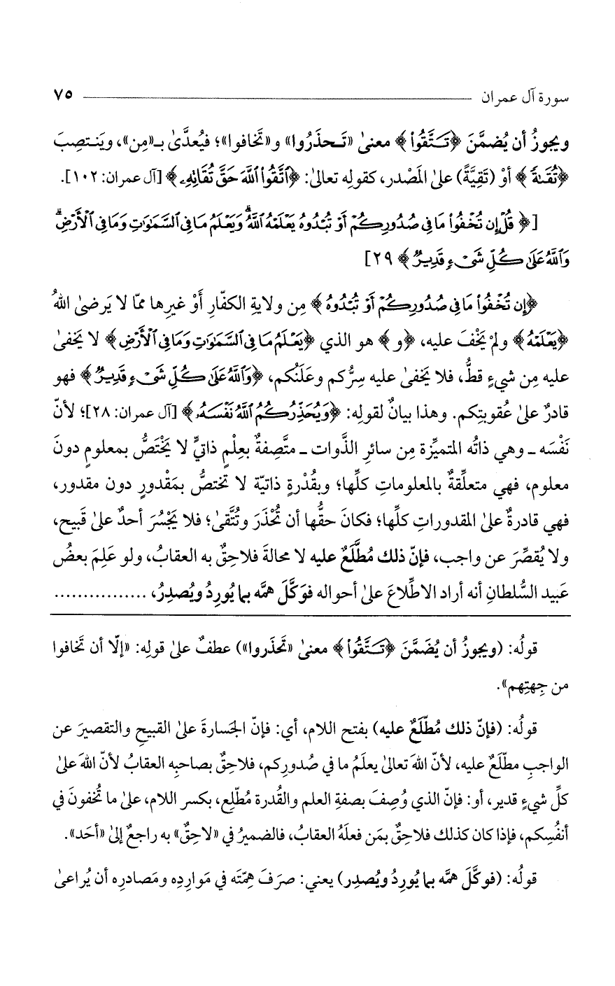 (إنْ تُخْفُوا ما فِي صُدُورِكُمْ أَوْ تُبْدُوه) من ولاية الكفار أو غيرها مما لا يرضى اللَّه (يَعْلَمْهُ) ولم يخف عليه، (و) هو الذي (يَعْلَمُ ما فِي السَّماواتِ وَما فِي الْأَرْضِ) لا يخفى عليه منه شيء قط، فلا يخفى عليه سركم وعلنكم (وَاللَّهُ عَلى كُلِّ شَيْءٍ قَدِير) ٌ فهو قادر على عقوبتكم. وهذا بيان لقوله (وَيُحَذِّرُكُمُ اللَّهُ نَفْسَهُ) [آل عمران: 28]؛ لأنّ نفسه ـ وهي ذاته المتميزة من سائر الذوات ـ متصفة بعلم ذاتي لا يختص بمعلوم دون معلوم، فهي متعلقة بالمعلومات كلها وبقدرة ذاتية لا تختص بمقدور دون مقدور، فهي قادرة على المقدورات كلها؛ فكان حقها أن تحذر وتتقى؛ فلا يجسر أحد على قبيح ولا يقصر عن واجب، فإن ذلك مطلع عليه لا محالة فلا حق به العقاب، ولو علم بعض عبيد السلطان أنه أراد الاطلاع على أحواله، فوكل همه بما يورد ويصدر، ........
