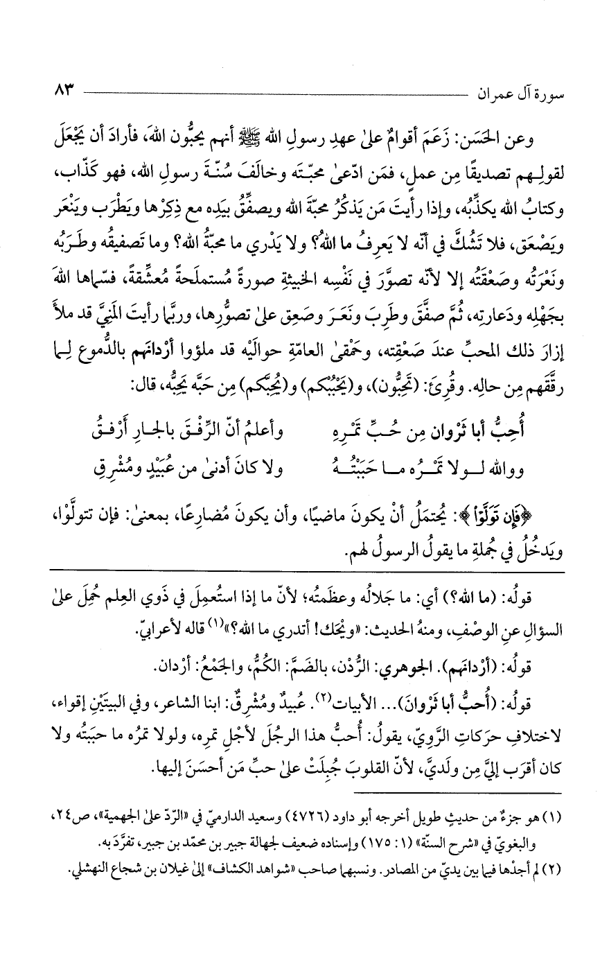 وعن الحسن: زعم أقوام على عهد رسول اللَّه صلى اللَّه عليه وسلم أنهم يحبون اللَّه، فأراد أن يجعل لقولهم تصديقًا من عمل، فمن ادعى محبته وخالف سنة رسول الله، فهو كذاب، وكتاب اللَّه يكذبه، وإذا رأيت من يذكر محبة اللَّه ويصفق بيديه مع ذكرها ويطرب وينعر ويصعق فلا تشك في أنه لا يعرف ما اللَّه؟ ولا يدرى ما محبة اللَّه؟ وما تصفيقه وطربه ونعرته وصعقته إلا لأنه تصوّر في نفسه الخبيثة صورة مستملحة معشقة، فسماها اللَّه بجهله ودعارته، ثم صفق وطرب ونعر وصعق على تصوّرها، وربما رأيت المنىَّ قد ملأ إزار ذلك المحب عند صعقته، وحمقى العامة على حواليه قد ملؤوا أردانهم بالدموع لما رققهم من حاله، وقرئ: (تحبون)، (ويحببكم) و (ويحبكم)، من حبه يحبه، قال: ....