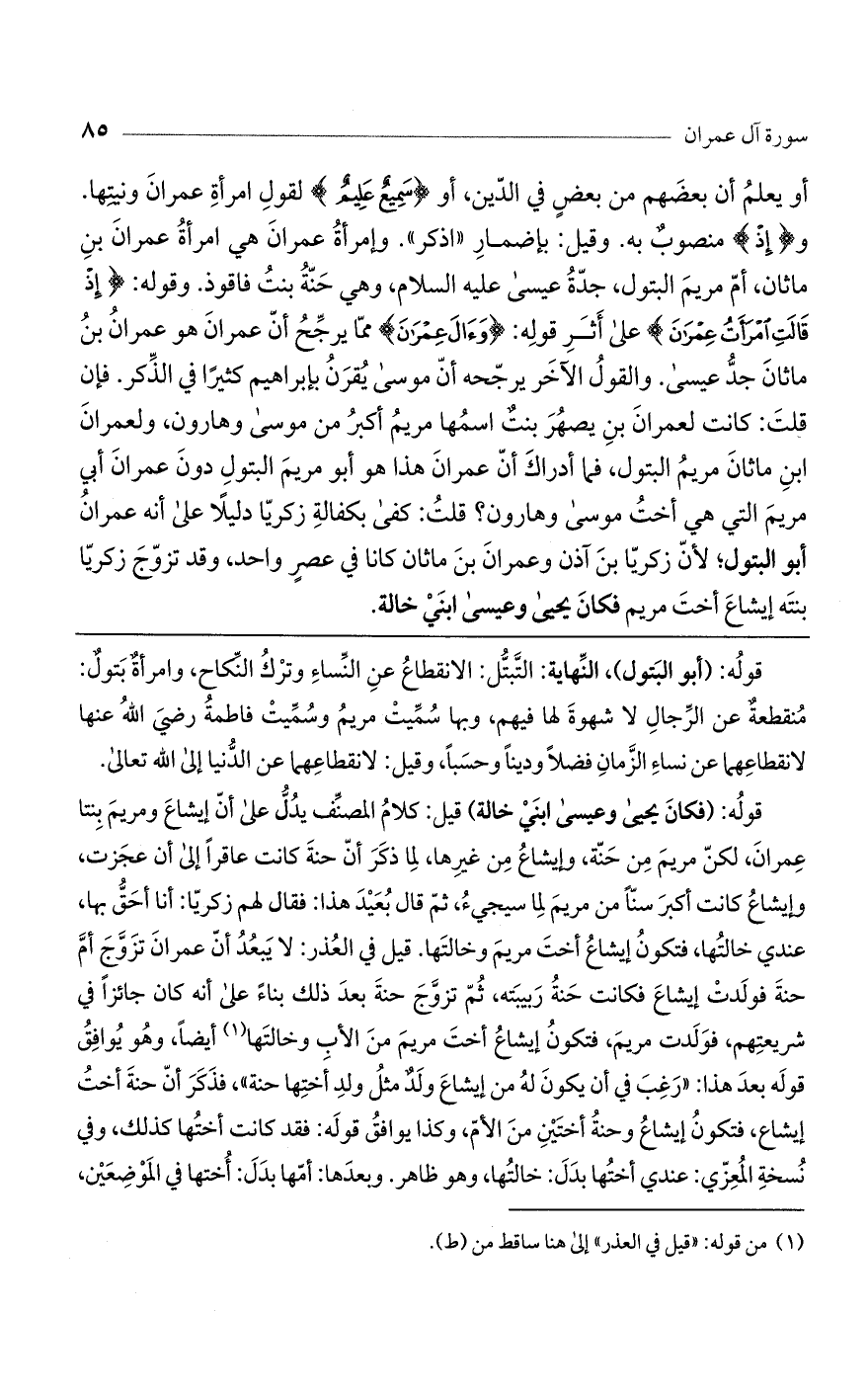 وقيل: بإضمار "اذكر". وامرأة عمران هي امرأة عمران بن ماثان، أمّ مريم البتول، جدّة عيسى عليه السلام، وهي حنة بنت فاقوذ. وقوله: (إِذْ قالَتِ امْرَأَتُ عِمْرانَ) على أثر قوله: (وَآلَ عِمْرانَ) مما يرجح أنّ عمران هو عمران بن ماثان جدّ عيسى، والقول الآخر يرجحه أن موسى يقرن بإبراهيم كثيراً في الذكر. فإن قلت: كانت لعمران بن يصهر بنت اسمها مريم أكبر من موسى وهارون، ولعمران ابن ماثان مريم البتول، فما أدراك أن عمران هذا هو أبو مريم البتول دون عمران أبى مريم التي هي أخت موسى وهارون؟ قلت: كفى بكفالة زكريا دليلاً على أنه عمران أبو البتول؛ لأن زكريا بن آذن وعمران بن ماثان كانا في عصر واحد، وقد تزوّج زكريا بنته إيشاع أخت مريم فكان يحيى وعيسى ابني خالة