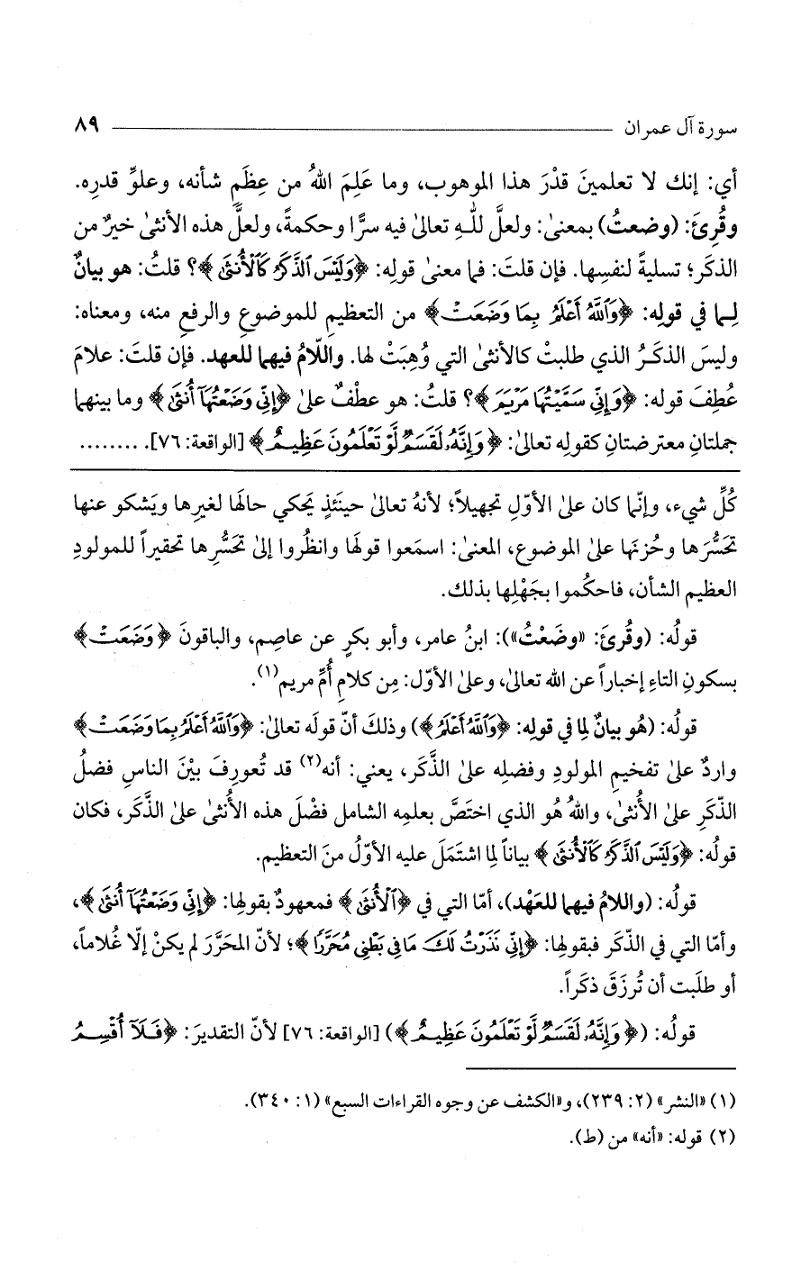 أي: أنك لا تعلمين قدر هذا الموهوب، وما علم اللَّه من عظم شأنه، وعلوّ قدره. وقرئ: (وضعت). بمعنى: ولعلّ للَّه تعالى فيه سراً وحكمة، ولعلّ هذه الأنثى خير من الذكر؛ تسلية لنفسها. فإن قلت: فما معنى قوله: (وَلَيْسَ الذَّكَرُ كَالْأُنْثى)؟ قلت: هو بيان لما في قوله: (وَاللَّهُ أَعْلَمُ بِما وَضَعَتْ) من التعظيم للموضوع والرفع منه، ومعناه: وليس الذكر الذي طلبت كالأنثى التي وهبت لها، واللام فيهما للعهد. فإن قلت: علام عطف قوله (وَإِنِّي سَمَّيْتُها مَرْيَمَ)؟ قلت: هو عطف على (إني وضعتها أنثى)، وما بينهما جملتان معترضتان، كقوله تعالى: (وإنه لقسم لو تعلمون عظيم) [الواقعة: 76]