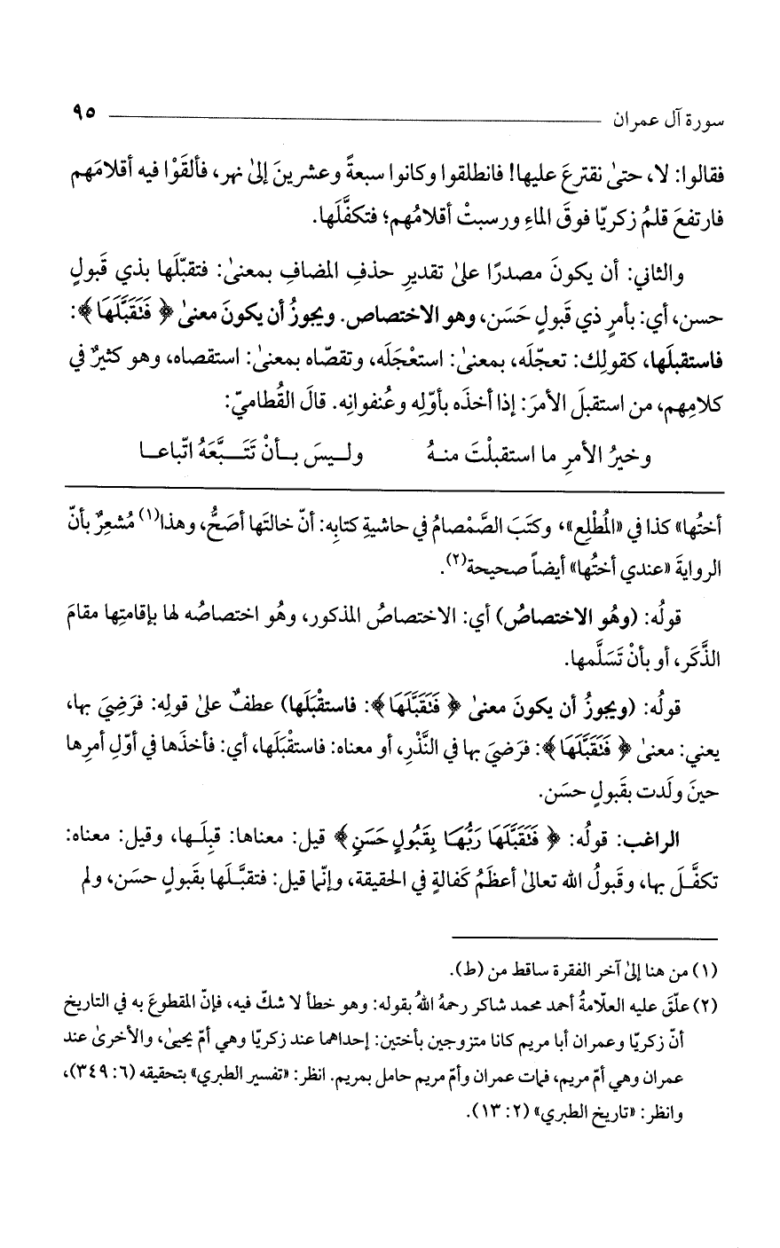 الراغب: قوله: (فَتَقَبَّلَهَا رَبُّهَا بِقَبُولٍ حَسَنٍ) قيل: معناها: قبلها، وقيل: معناه: تكفل بها، وقبول الله تعالى أعظم كفالة في الحقيقة، وإنما قيل: فتقبلها بقبول حسن، ولم