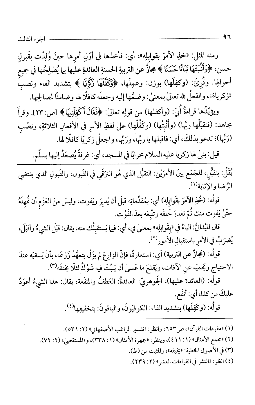 ومنه المثل: «خذ الأمر بقوابله»، أي فأخذها في أوّل أمرها حين ولدت بقبول حسن (وَأَنْبَتَها نَباتاً حَسَناً) مجاز عن التربية الحسنة العائدة عليها بما يصلحها في جميع أحوالها. وقرئ: (وكفلها) بوزن: وعملها، (وَكَفَّلَها زكَرِيَّا) بتشديد الفاء ونصب (زكرياء)، والفعل للَّه تعالى بمعنى: وضمها إليه وجعله كافلاً لها وضامناً لمصالحها. ويؤيدها قراءة أبيّ: (وأكفلها)، من قوله تعالى: (فَقالَ أَكْفِلْنِيها) [ص: 23]. وقرأ مجاهد: (فتقبلها ربها)، (وأنبتها)، (وكفلها)، على لفظ الأمر في الأفعال الثلاثة، ونصب (ربها)، تدعو بذلك، أي: فاقبلها يا ربها، وربها، واجعل زكريا كافلاً لها.