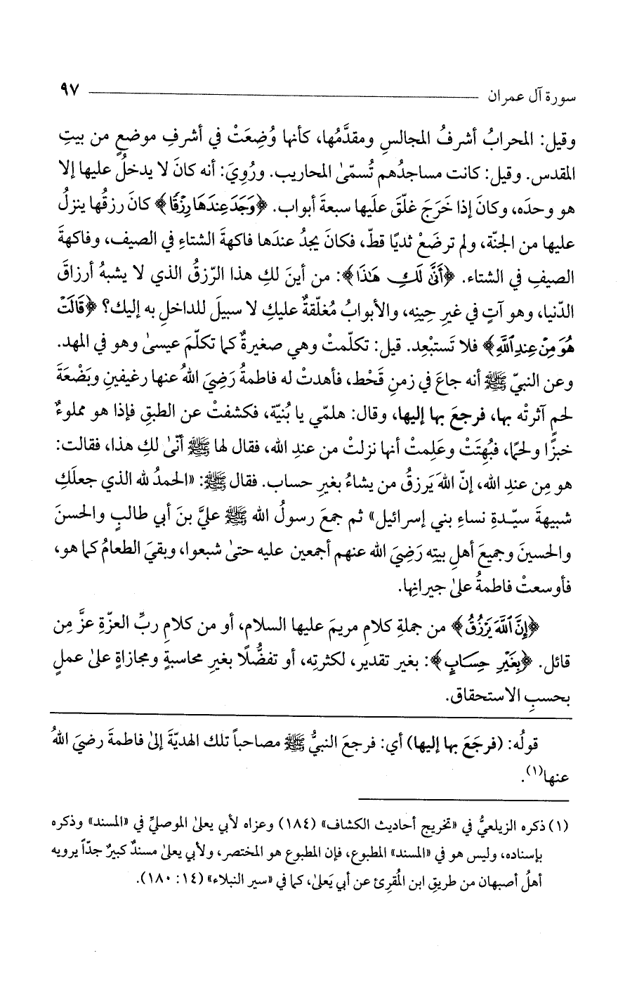 وقيل: المحراب أشرف المجالس ومقدّمها، كأنها وضعت في أشرف موضع من بيت المقدس. وقيل: كانت مساجدهم تسمى المحاريب. وروى أنه كان لا يدخل عليها إلا هو وحده، وكان إذا خرج غلق عليها سبعة أبواب (وَجَدَ عِنْدَها رِزْقاً) كان رزقها ينزل عليها من الجنة ولم ترضع ثدياً قط، فكان يجد عندها فاكهة الشتاء في الصيف وفاكهة الصيف في الشتاء (أَنَّى لَكِ هذا): من أين لك هذا الرزق الذي لا يشبه أرزاق الدنيا وهو آت في غير حينه والأبواب مغلقة عليك لا سبيل للداخل به إليك؟ (قالَتْ هُوَ مِنْ عِنْدِ اللَّهِ) فلا تستبعد. قيل: تكلمت وهي صغيرة كما تكلم عيسى وهو في المهد. وعن النبي صلى اللَّه عليه وسلم: أنه جاع في زمن قحط فأهدت له فاطمة رضي اللَّه عنها رغيفين وبضعة لحم آثرته بها، فرجع بها إليها، وقال: هلمي يا بنية فكشفت عن الطبق فإذا هو مملوء خبزاً ولحماً، فبهتت وعلمت أنها نزلت من عند اللَّه، فقال لها صلى اللَّه عليه وسلم: أنى لك هذا؟ فقالت: