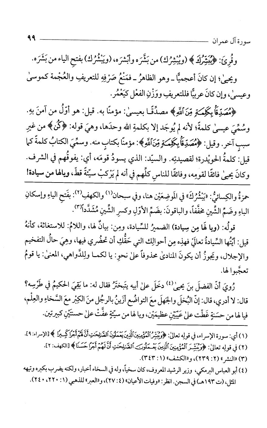 (مُصَدِّقاً بِكَلِمَةٍ مِنَ اللَّهِ) مصدّقا بعيسى: مؤمناً به. قيل: هو أول من آمن به، وسمى عيسى كلمة؛ لأنه لم يوجد إلا بكلمة اللَّه وحدها، وهي قوله: (كُنْ) من غير سبب آخر. وقيل: (مصدّقا بكلمة من اللَّه)، مؤمناً بكتاب منه. وسمى الكتاب كلمة، كما قيل: كلمة الحويدرة لقصيدته. والسيد: الذي يسود قومه، أي: يفوقهم في الشرف. وكان يحيى فائقا لقومه، وفائقا للناس كلهم في أنه لم يركب سيئة قط، ويا لها من سيادة!