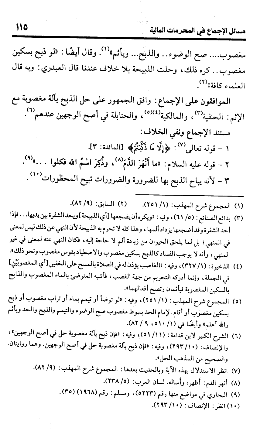 • الموافقون على الإجماع: وافق الجمهور على حل الذبح بآلة مغصوبة مع الإثم: الحنفية (¬3)، والمالكية (¬4) (¬5)، والحنابلة في أصح الوجهين عندهم (¬6).