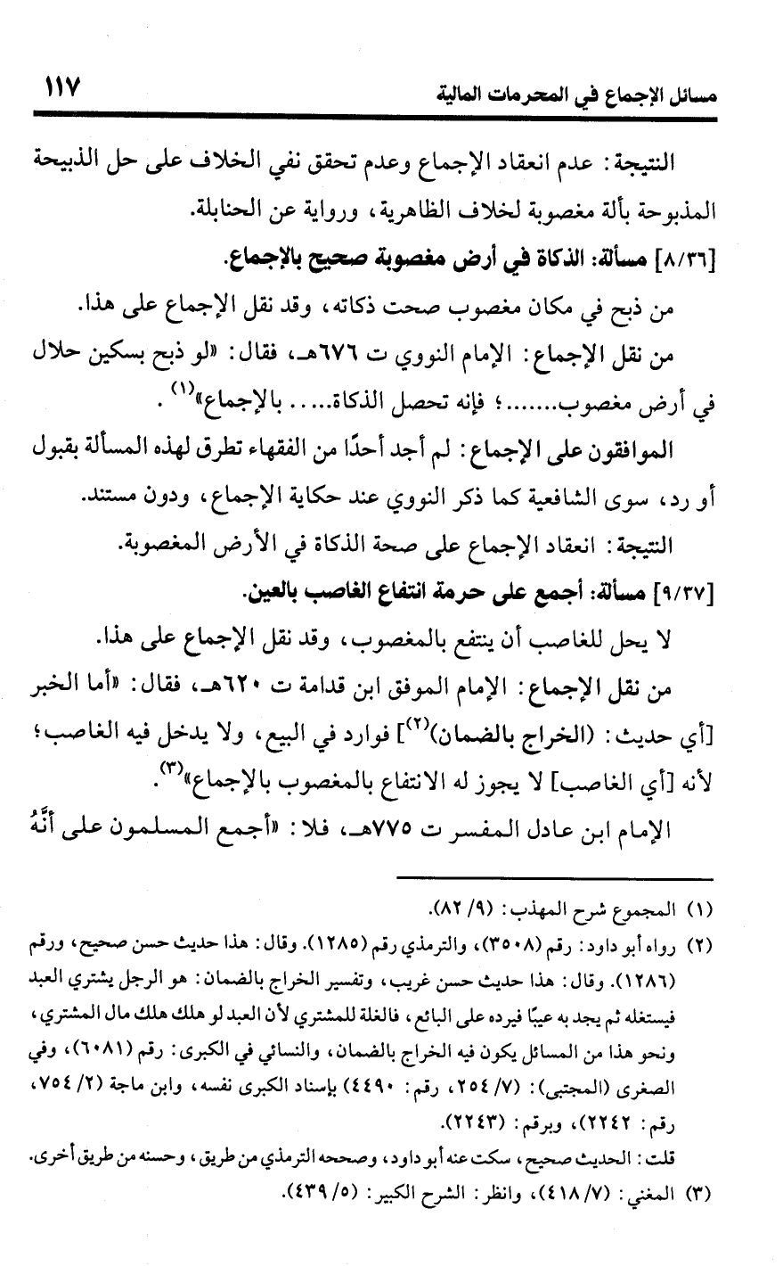 • الموافقون على الإجماع: لم أجد أحدًا من الفقهاء تطرق لهذه المسألة بقبول أو رد، سوى الشافعية كما ذكر النووي عند حكايته الإجماع، ودون مستند.Rانعقاد الإجماع على صحة الذكاة في الأرض المغصوبة.