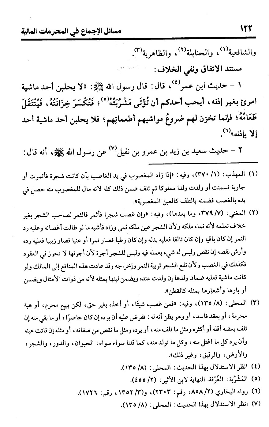 (¬3) المحلى: (8/ 135)، وفيه: "فمن غصب شيئًا، أو أخذه بغير حق، لكن ببيع محرم، أو هبة محرمة، أو بعقد فاسد، أو وهو يظن أنه له: ففرض عليه أن يرده إن كان حاضرًا، أو ما بقي منه إن تلف بعضه أقله أو أكثره ومثل ما تلف منه، أو يرده ومثل ما نقص من صفاته، أو مثله إن فاتت عينه وأن يرد كل ما اغتل منه، وكل ما تولد منه، كما قلنا سواء سواء: الحيوان، والدور، والشجر، والأرض، والرقيق، وغير ذلك".