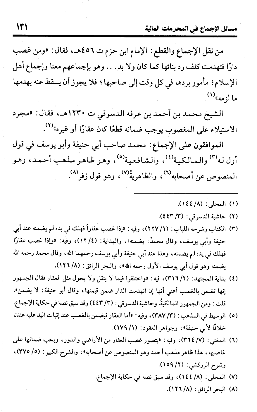 (¬4) بداية المجتهد: (2/ 316)، فيه: "واختلفوا فيما لا ينقل ولا يحول مثل العقار فقال الجمهور إنها تضمن بالغصب أعني أنها إن انهدمت الدار ضمن قيمتها، وقال أبو حنيفة: لا يضمن". قلت: ومن الجمهور المالكيةُ. وحاشية الدسوقي: (3/ 443) وقد سبق نصه في حكاية الإجماع.