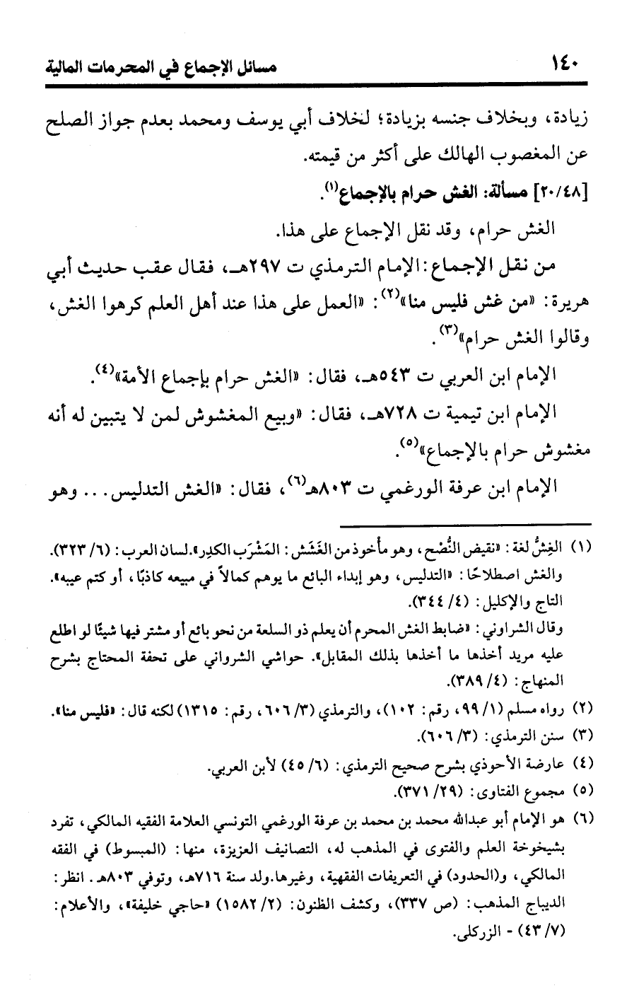 • من نقل الإجماع: الإمام الترمذي ت 297 هـ، فقال عقب حديث أبي هريرة: "من غش فليس منا" (¬2): "العمل على هذا عند أهل العلم كرهوا الغش، وقالوا الغش حرام" (¬3).