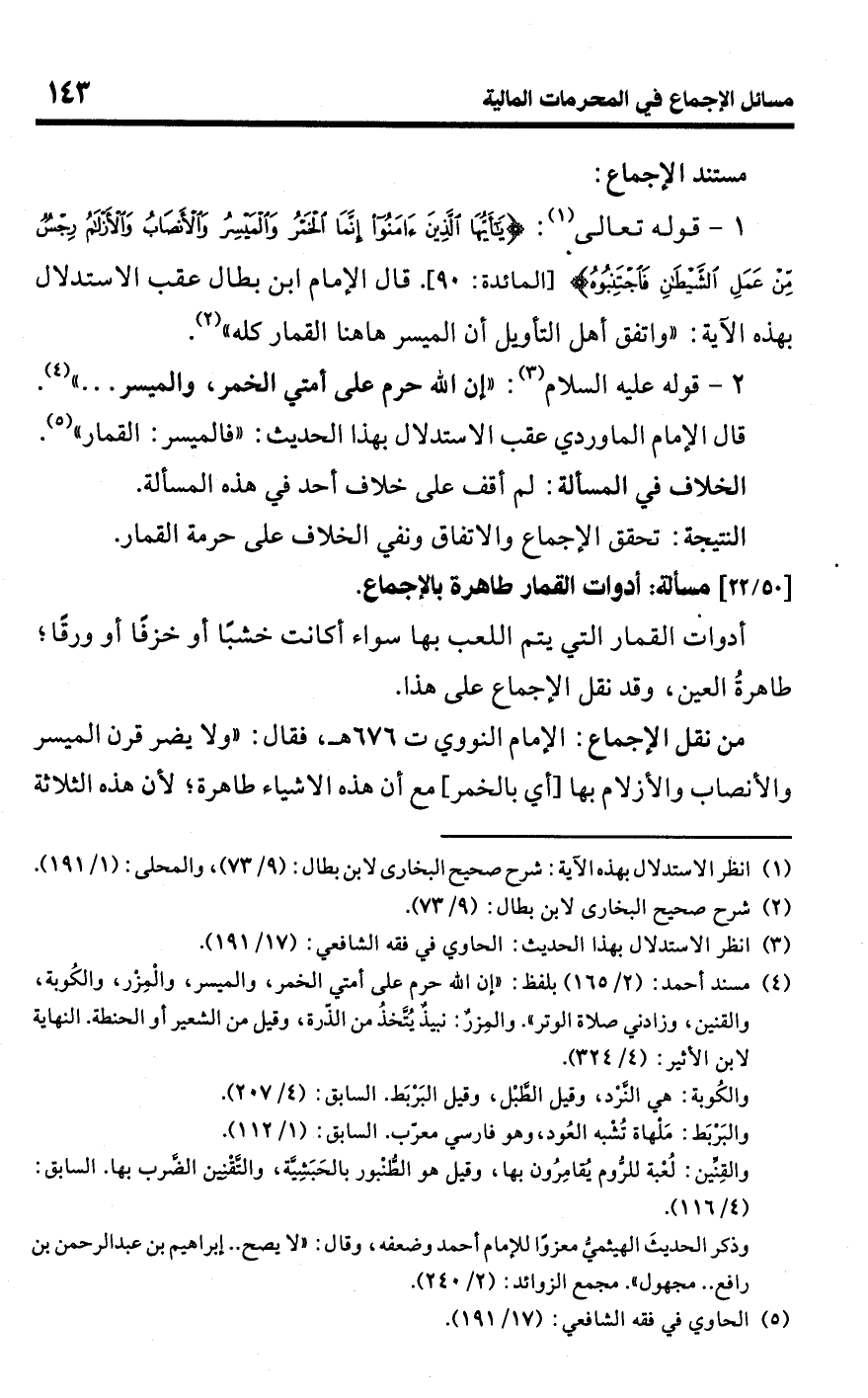 1 - قوله تعالى (¬1): {يَاأَيُّهَا الَّذِينَ آمَنُوا إِنَّمَا الْخَمْرُ وَالْمَيْسِرُ وَالْأَنْصَابُ وَالْأَزْلَامُ رِجْسٌ مِنْ عَمَلِ الشَّيْطَانِ فَاجْتَنِبُوهُ} [المائدة: 90]. قال الإمام ابن بطال عقب الاستدلال بهذه الآية: "واتفق أهل التأويل أن الميسر ها هنا القمار كله" (¬2).