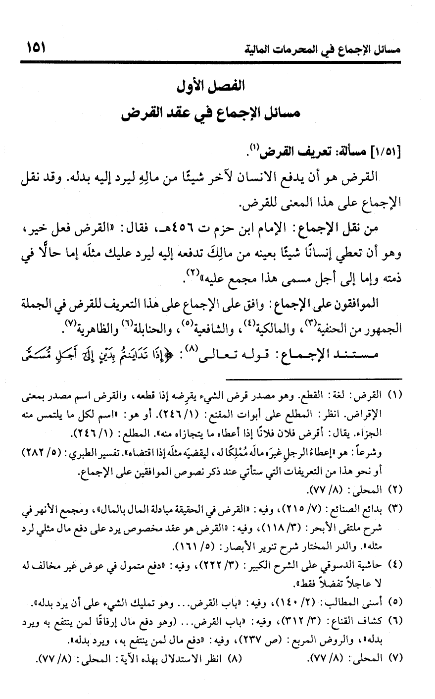 • الموافقون على الإجماع: وافق على الإجماع على هذا التعريف للقرض في الجملة الجمهور من الحنفية (¬3)، والمالكية (¬4)، والشافعية (¬5)، والحنابلة (¬6) والظاهرية (¬7).