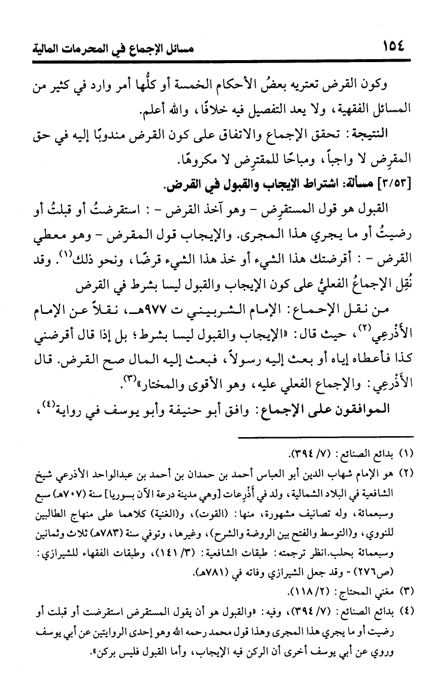 • من نقل الإجماع: الإمام الشربيني ت 977 هـ، نقلًا عن الإمام الأَذْرعِي (¬2)، حيث قال: "الإيجاب والقبول ليسا بشرط؛ بل إذا قال أقرضني كذا فأعطاه إياه أو بعث إليه رسولًا، فبعث إليه المال صح القرض. قال الأَذْرعِي: والإجماع الفعلي عليه، وهو الأقوى والمختار" (¬3).