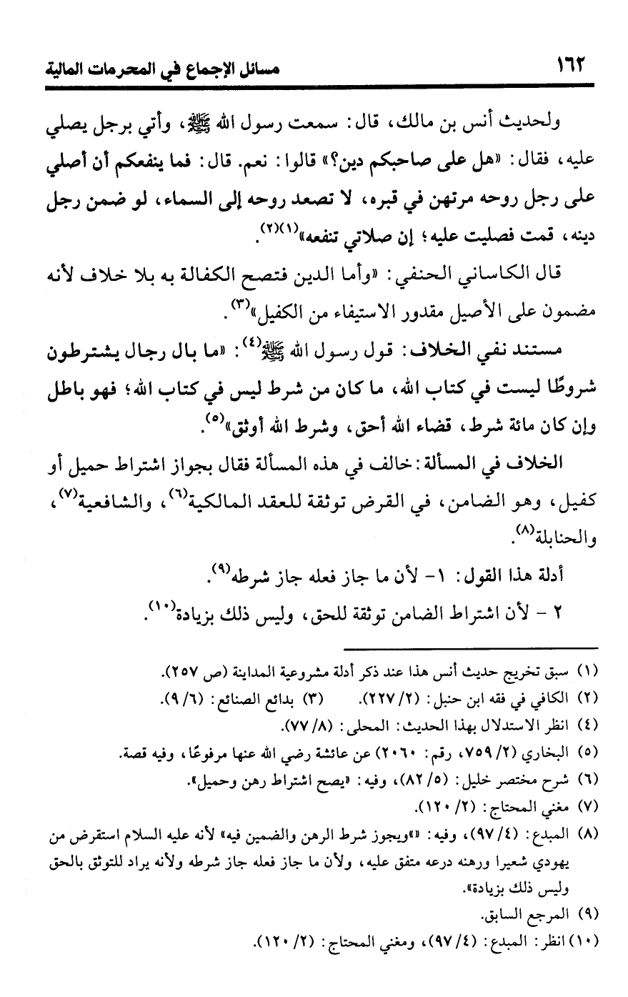 • الخلاف في المسألة: خالف في هذه المسألة فقال بجواز اشتراط حميل أو كفيل، وهو الضامن، في القرض توثقة للعقد المالكية (¬6)، والشافعية (¬7)، والحنابلة (¬8).