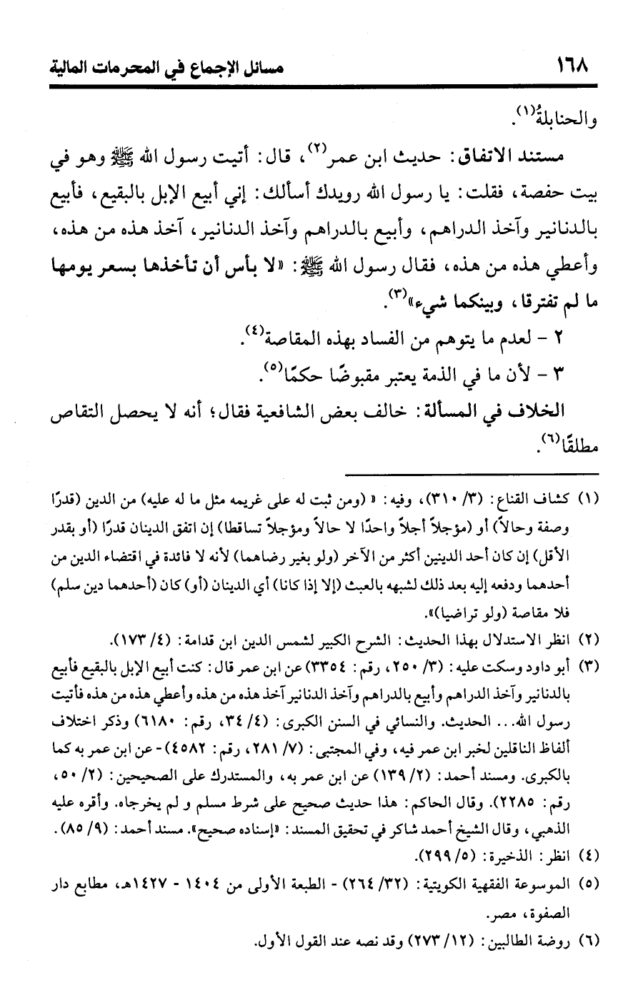 (¬3) أبو داود وسكت عليه: (3/ 250، رقم: 3354) عن ابن عمر قال: كنت أبيع الإبل بالبقيع فأبيع بالدنانير وآخذ الدراهم وأبيع بالدراهم وآخذ الدنانير آخذ هذه من هذه وأعطي هذه من هذه فأتيت رسول اللَّه. . . الحديث. والنسائي فى السنن الكبرى: (4/ 34، رقم: 6180) وذكر اختلاف ألفاظ الناقلين لخبر ابن عمر فيه، وفي المجتبى: (7/ 281، رقم: 4582) - عن ابن عمر به كما بالكبرى. ومسند أحمد: (2/ 139) عن ابن عمر به، والمستدرك على الصحيحين: (2/ 50، رقم: 2285). وقال الحاكم: هذا حديث صحيح على شرط مسلم ولم يخرجاه. وأقره عليه الذهبي، وقال الشيخ أحمد شاكر في تحقيق المسند: "إسناده صحيح". مسند أحمد: (9/ 85).