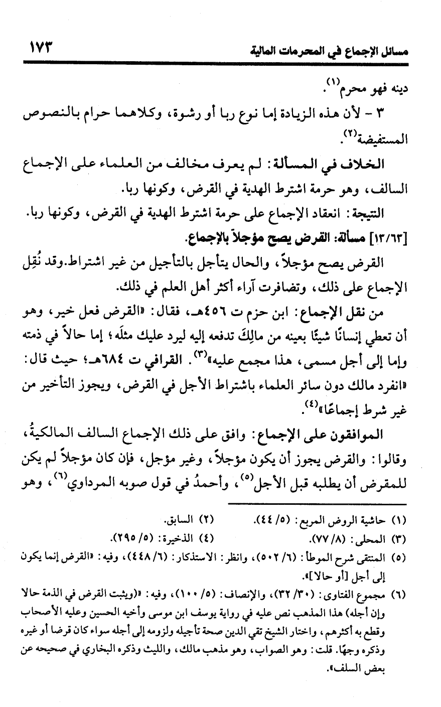 • من نقل الإجماع: ابن حزم ت 456 هـ، فقال: (القرض فعل خير، وهو أن تعطي إنسانًا شيئًا بعينه من مالِكَ تدفعه إليه ليرد عليك مثلَه؛ إما حالًا في ذمته وإما إلى أجل مسمى، هذا مجمع عليه" (¬3). القرافي ت 684 هـ؛ حيث قال: "انفرد مالك دون سائر العلماء باشتراط الأجل في القرض، ويجوز التأخير من غير شرط إجماعًا" (¬4).