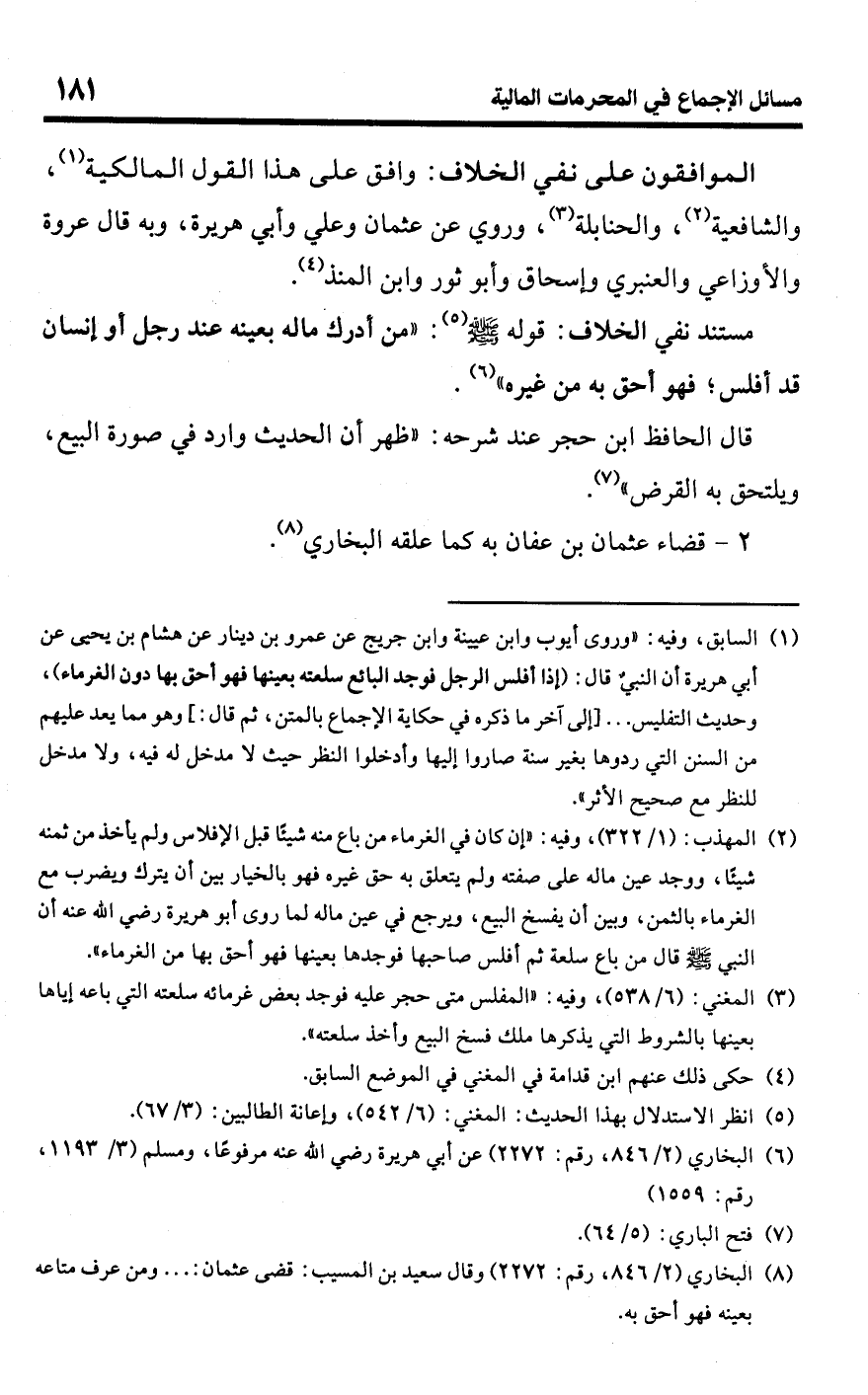 • مستند نفي الخلاف: قوله -صلى اللَّه عليه وسلم- (¬5): "من أدرك ماله بعينه عند رجل أو إنسان قد أفلس؛ فهو أحق به من غيره" (¬6).