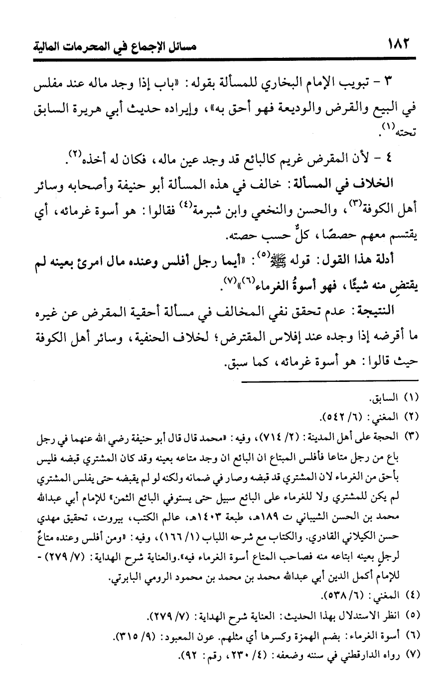 • أدلة هذا القول: قوله -صلى اللَّه عليه وسلم- (¬5): "أيما رجل أفلس وعنده مال امرئ بعينه لم يقتضِ منه شيئًا، فهو أسوةُ الغرماء (¬6) " (¬7).Rعدم تحقق نفي المخالف في مسألة أحقية المقرض عن غيره ما أقرضه إذا وجده عند إفلاس المقترض؛ لخلاف الحنفية، وسائر أهل الكوفة حيث قالوا: هو أسوة غرمائه، كما سبق.