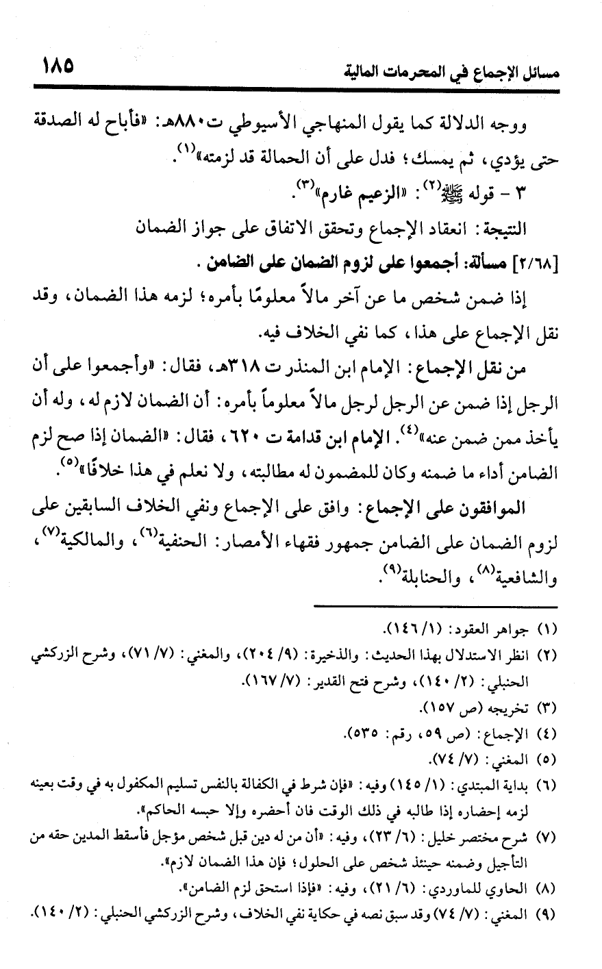 • الموافقون على الإجماع: وافق على الإجماع ونفي الخلاف السابقين على لزوم الضمان على الضامن جمهور فقهاء الأمصار: الحنفية (¬6)، والمالكية (¬7)، والشافعية (¬8)، والحنابلة (¬9).