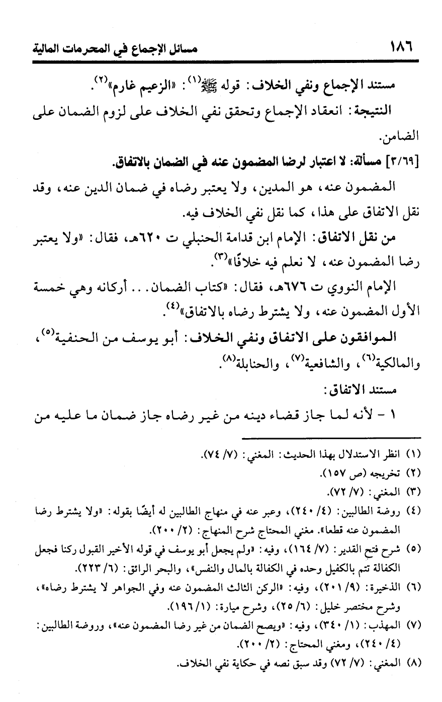 • من نقل الاتفاق: الإمام ابن قدامة الحنبلي ت 620 هـ، فقال: "ولا يعتبر رضا المضمون عنه، لا نعلم فيه خلافًا" (¬3).