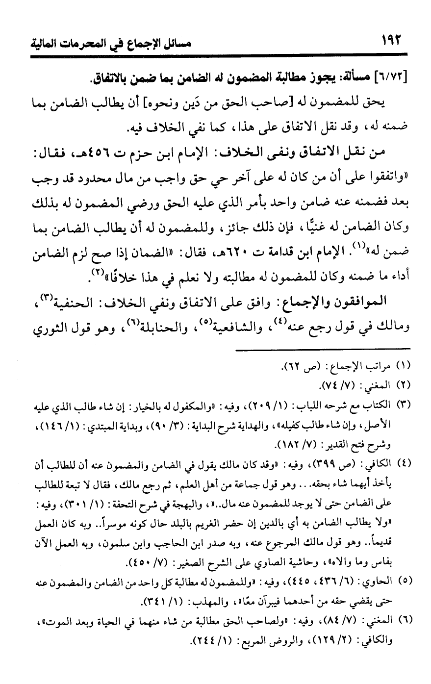 • من نقل الاتفاق ونفى الخلاف: الإمام ابن حزم ت 456 هـ، فقال: "واتفقوا على أن من كان له على آخر حي حق واجب من مال محدود قد وجب بعد فضمنه عنه ضامن واحد بأمر الذي عليه الحق ورضي المضمون له بذلك وكان الضامن له غنيًّا، فإن ذلك جائز، وللمضمون له أن يطالب الضامن بما ضمن له" (¬1). الإمام ابن قدامة ت 620 هـ، فقال: "الضمان إذا صح لزم الضامن أداء ما ضمنه وكان للمضمون له مطالبته ولا نعلم في هذا خلافًا" (¬2).