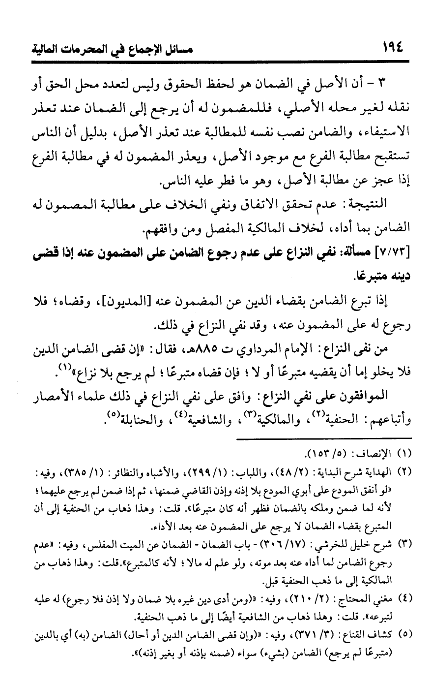 [73/ 7] مسألة: نفي النزاع على عدم رجوع الضامن على المضمون عنه إذا قضى دينه متبرعًا.
