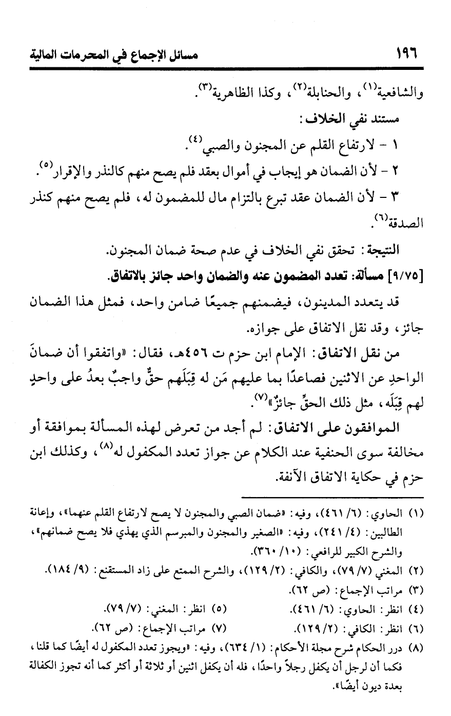 • من نقل الاتفاق: الإمام ابن حزم ت 456 هـ، فقال: "واتفقوا أن ضمانَ الواحدِ عن الاثنين فصاعدًا بما عليهم مَن له قِبَلَهم حقٌّ واجبٌ بعدُ على واحدٍ لهم قِبَلَه، مثل ذلك الحقِّ جائزٌ" (¬7).