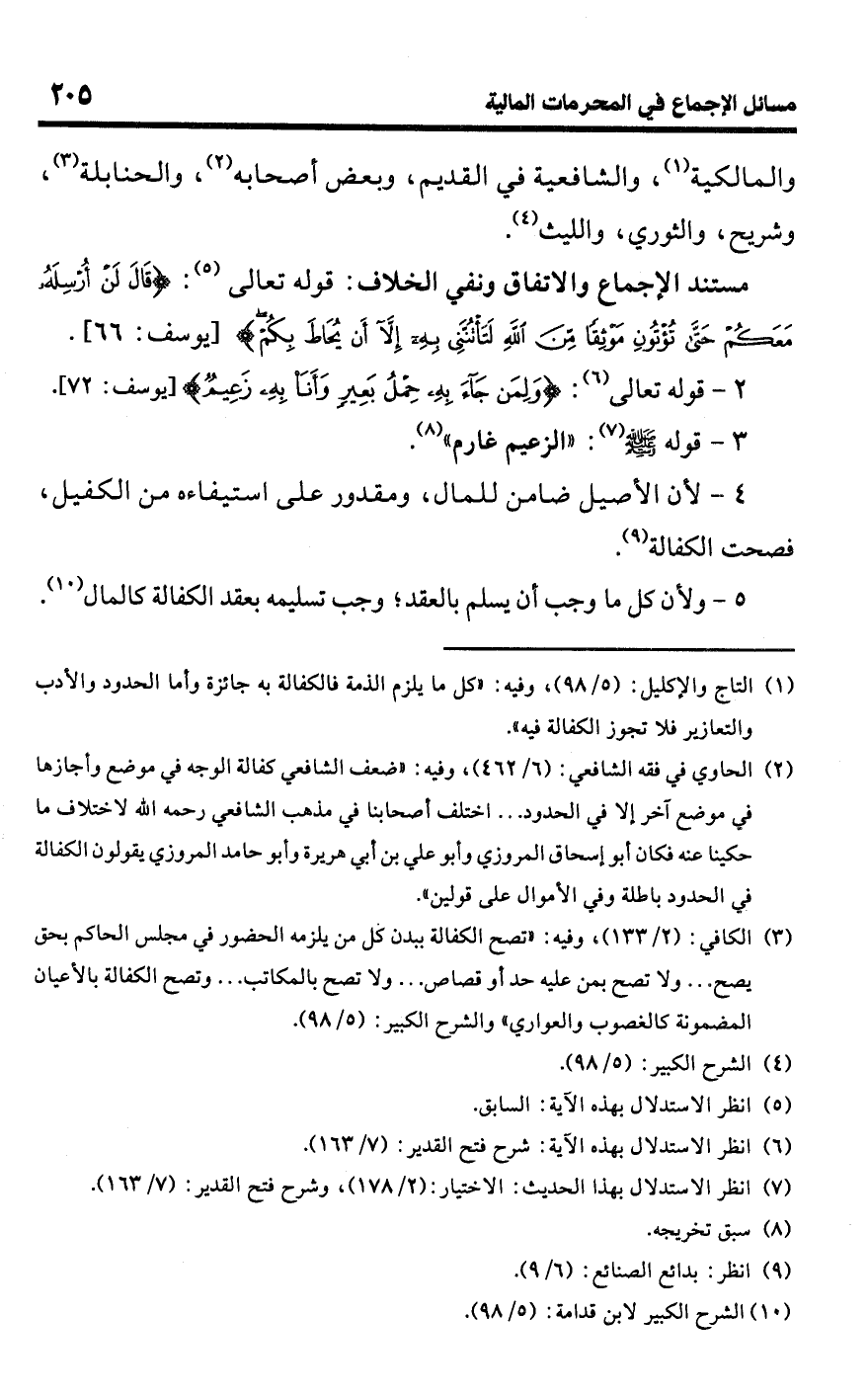 • مستند الإجماع والاتفاق ونفي الخلاف: قوله تعالى (¬5): {قَالَ لَنْ أُرْسِلَهُ مَعَكُمْ حَتَّى تُؤْتُونِ مَوْثِقًا مِنَ اللَّهِ لَتَأْتُنَّنِي بِهِ إِلَّا أَنْ يُحَاطَ بِكُمْ} [يوسف: 66].