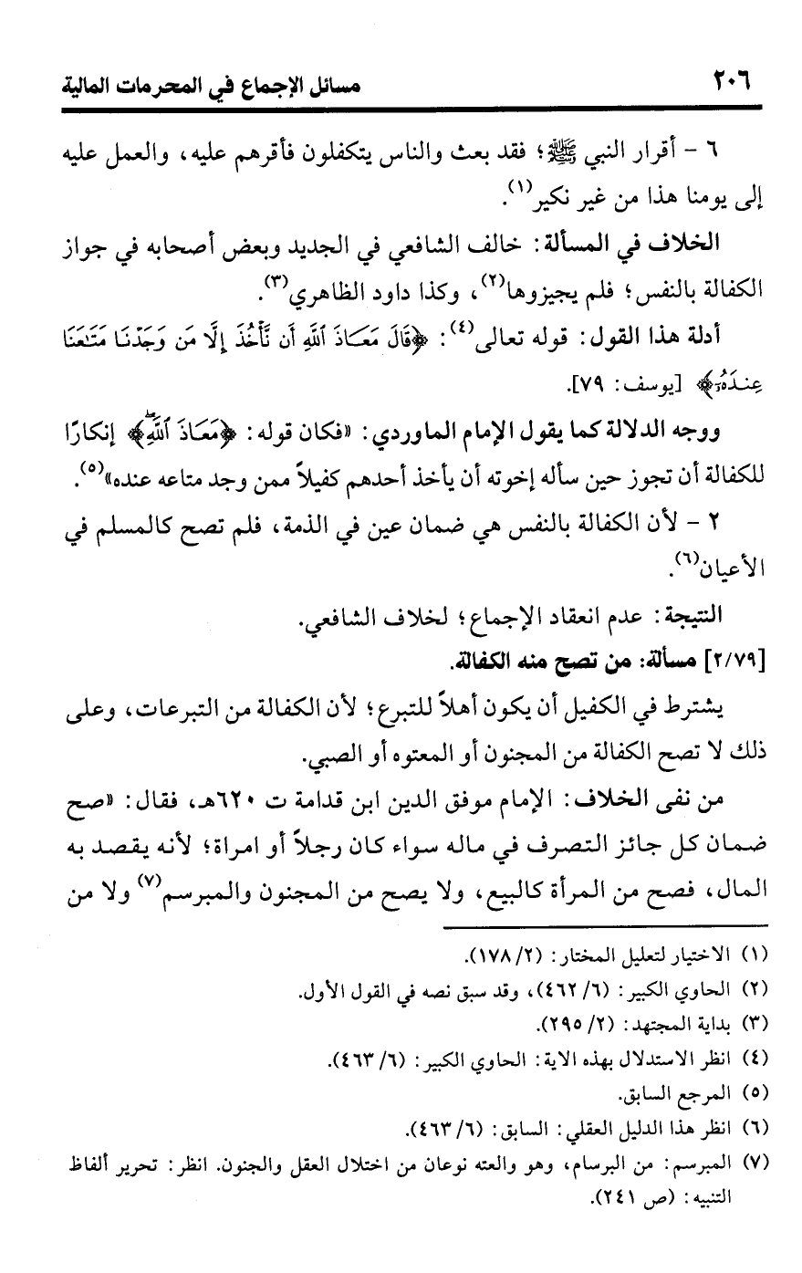 • من نفى الخلاف: الإمام موفق الدين ابن قدامة ت 620 هـ، فقال: "صح ضمان كل جائز التصرف في ماله سواء كان رجلًا أو امرأة؛ لأنه يقصد به المال، فصح من المرأة كالبيع، ولا يصح من المجنون والمبرسم (¬7) ولا من