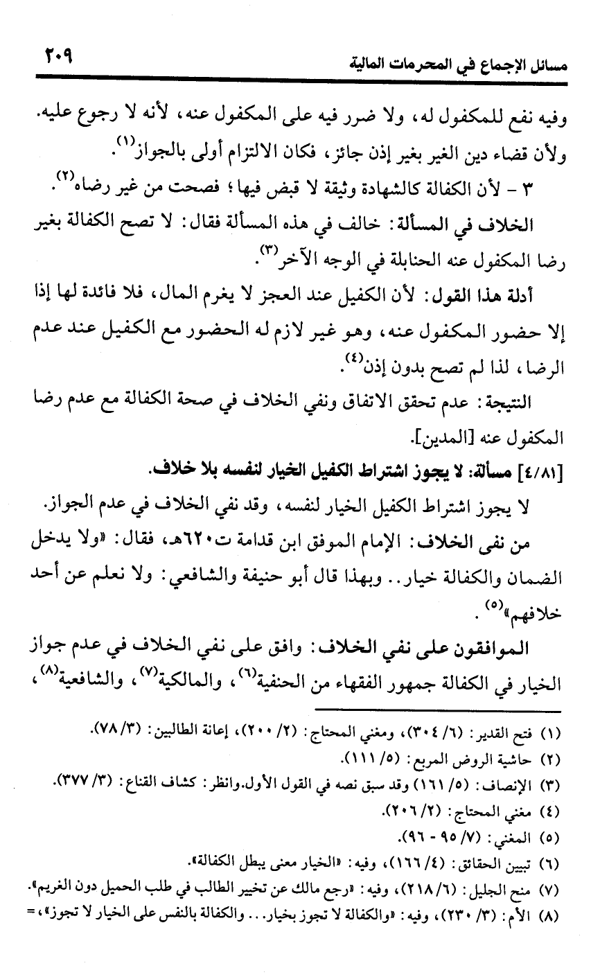 • أدلة هذا القول: لأن الكفيل عند العجز لا يغرم المال، فلا فائدة لها إذا إلا حضور المكفول عنه، وهو غير لازم له الحضور مع الكفيل عند عدم الرضا، لذا لم تصح بدون إذن (¬4).Rعدم تحقق الاتفاق ونفي الخلاف في صحة الكفالة مع عدم رضا المكفول عنه [المدين].