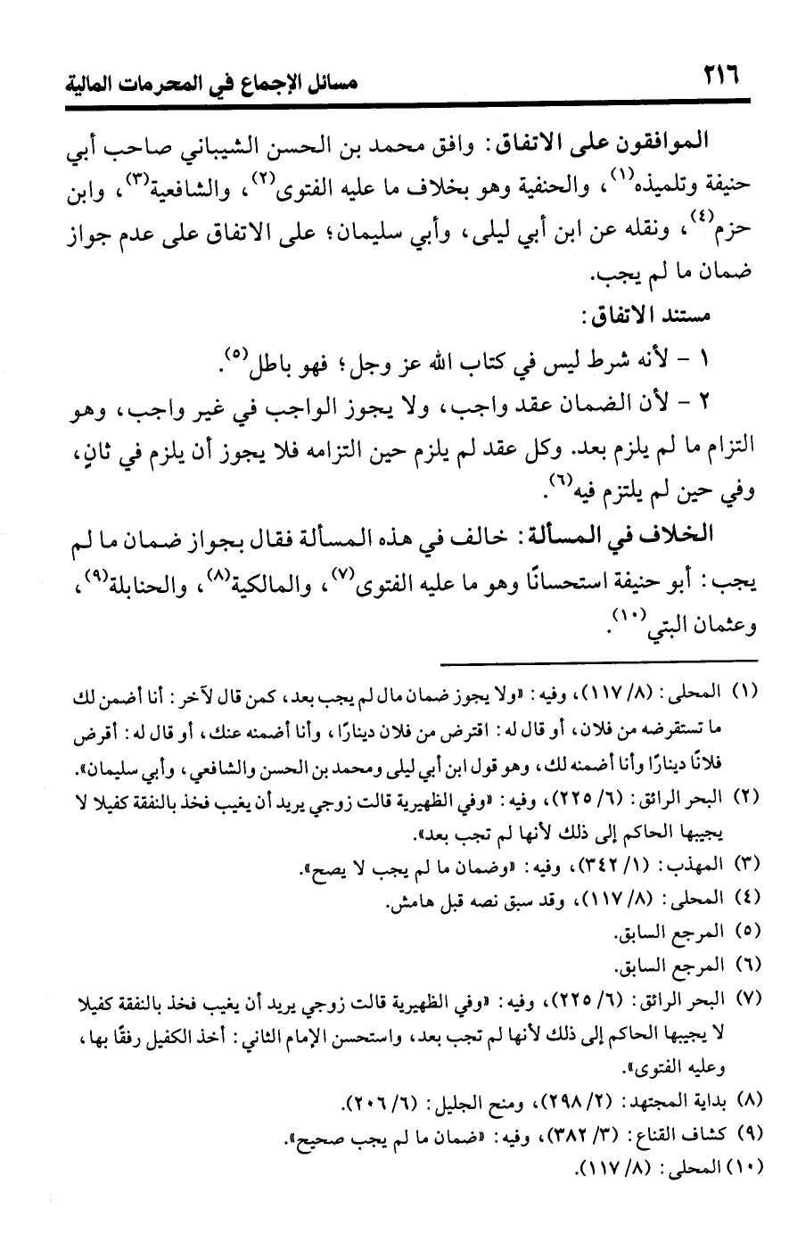 • الموافقون على الاتفاق: وافق محمد بن الحسن الشيباني صاحب أبي حنيفة وتلميذه (¬1)، والحنفية وهو بخلاف ما عليه الفتوى (¬2)، والشافعية (¬3)، وابن حزم (¬4)، ونقله عن ابن أبي ليلى، وأبي سليمان؛ على الاتفاق على عدم جواز ضمان ما لم يجب.