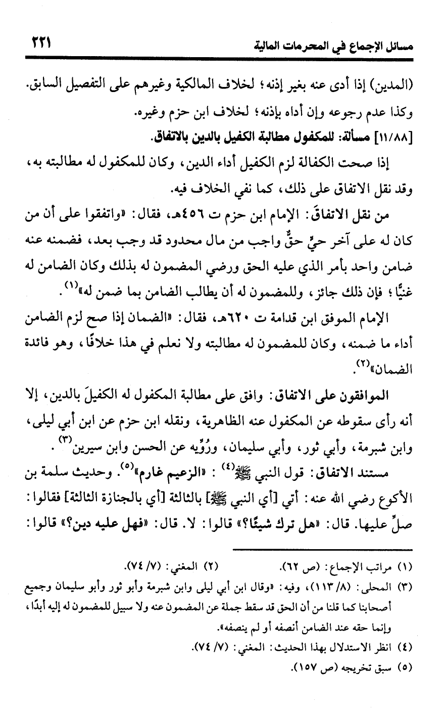 • من نقل الاتفاقَ: الإمام ابن حزم ت 456 هـ، فقال: "واتفقوا على أن من كان له على آخر حيِّ حقٌّ واجب من مال محدود قد وجب بعد، فضمنه عنه ضامن واحد بأمر الذي عليه الحق ورضي المضمون له بذلك وكان الضامن له غنيًا؛ فإن ذلك جائز، وللمضمون له أن يطالب الضامن بما ضمن له" (¬1).