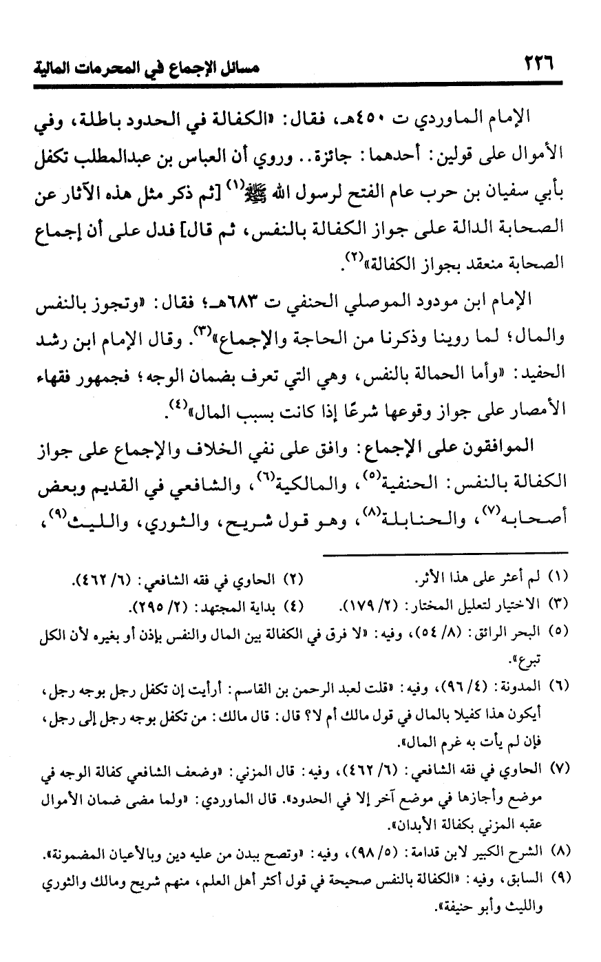 الإمام الماوردي ت 450 هـ، فقال: "الكفالة في الحدود باطلة، وفي الأموال على قولين: أحدهما: جائزة. . وروي أن العباس بن عبد المطلب تكفل بأبي سفيان بن حرب عام الفتح لرسول اللَّه -صلى اللَّه عليه وسلم- (¬1) [ثم ذكر مثل هذه الآثار عن الصحابة الدالة على جواز الكفالة بالنفس، ثم قال] فدل على أن إجماع الصحابة منعقد بجواز الكفالة" (¬2).