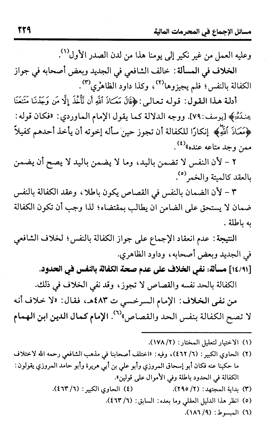 • من نفى الخلاف: الإمام السرخسي ت 483 هـ، فقال: "لا خلاف أنه لا تصح الكفالة بنفس الحد والقصاص" (¬6). الإمام كمال الدين ابن الهمام