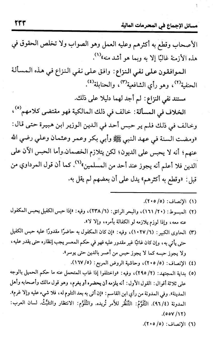 • الخلاف في المسألة: خالف في ذلك المالكية فهو مقتضى كلامهم (¬5)، وخالف في ذلك فلم ير حبس أحد في الدين الوزير ابن هبيرة حتى قال: "ومضت السنة في عهد النبي -صلى اللَّه عليه وسلم- وأبي بكر وعمر وعثمان وعلى رضي اللَّه عنهم؛ أنه لا يحبس على الديون؛ لكن يتلازم الخصمان. وأما الحبس الآن على الدين فلا أعلم أنه يجوز عند أحد من المسلمين" (¬6). كما أن قول المرداوي من قبل: "وقطع به أكثرهم" يدل على أن بعضهم لم يقل به.