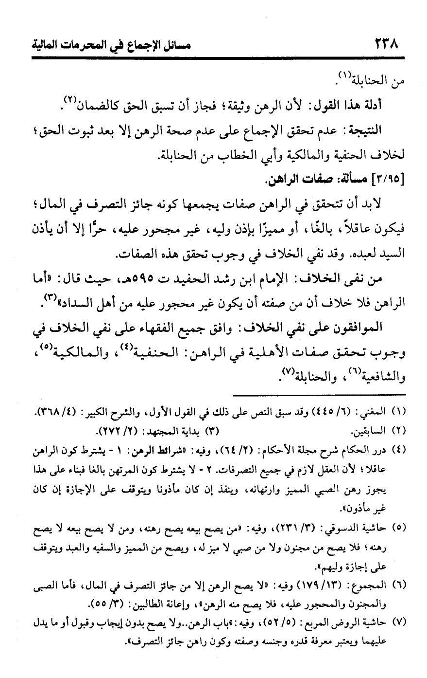 • من نفى الخلاف: الإمام ابن رشد الحفيد ت 595 هـ، حيث قال: "أما الراهن فلا خلاف أن من صفته أن يكون غير محجور عليه من أهل السداد" (¬3).