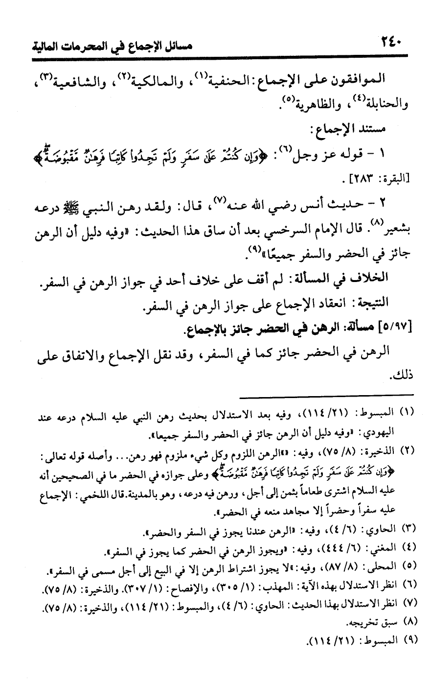 • الخلاف في المسألة: لم أقف على خلاف أحد في جواز الرهن في السفر.Rانعقاد الإجماع على جواز الرهن في السفر.
