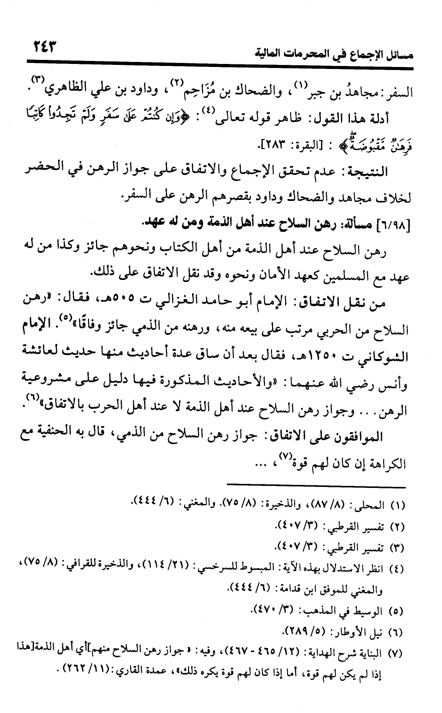 • من نقل الاتفاق: الإمام أبو حامد الغزالي ت 505 هـ، فقال: "رهن السلاح من الحربي مرتب على بيعه منه، ورهنه من الذمي جائز وفاقًا" (¬5).