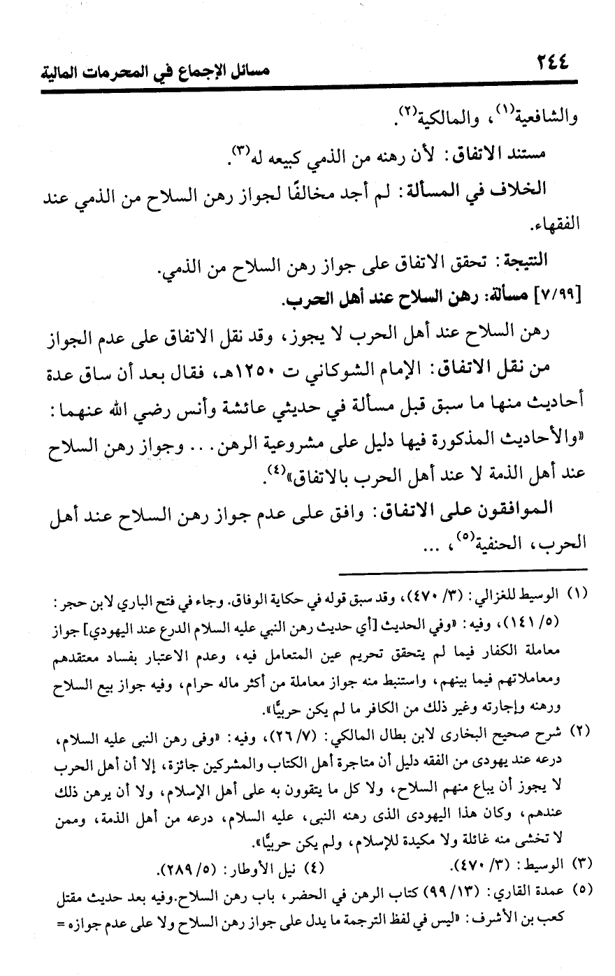 (¬1) الوسيط للغزالي: (3/ 470)، وقد سبق قوله في حكاية الوفاق. وجاء في فتح الباري لابن حجر: (5/ 141)، وفيه: "وفي الحديث [أي حديث رهن النبي عليه السلام الدرع عند اليهودي] جواز معاملة الكفار فيما لم يتحقق تحريم عين المتعامل فيه، وعدم الاعتبار بفساد معتقدهم ومعاملاتهم فيما بينهم، واستنبط منه جواز معاملة من أكثر ماله حرام، وفيه جواز بيع السلاح ورهنه وإجارته وغير ذلك من الكافر ما لم يكن حربيًّا".