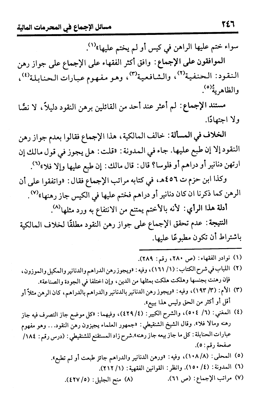 • أدلة هذا الرأي: لأنه بالأختم يمتنع من الانتفاع به ورد مثلها (¬8).Rعدم تحقق الإجماع على جواز رهن النقود مطلقًا لخلاف المالكية باشتراط أن تكون مطبوعًا عليها.