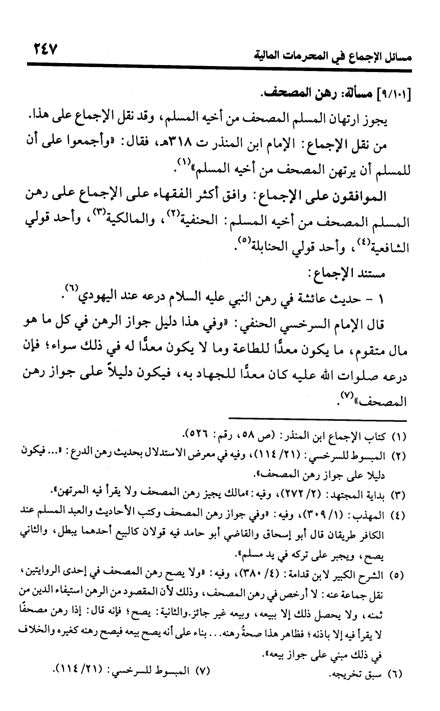 • من نقل الإجماع: الإمام ابن المنذر ت 318 هـ، فقال: "وأجمعوا على أن للمسلم أن يرتهن المصحف من أخيه المسلم" (¬1).