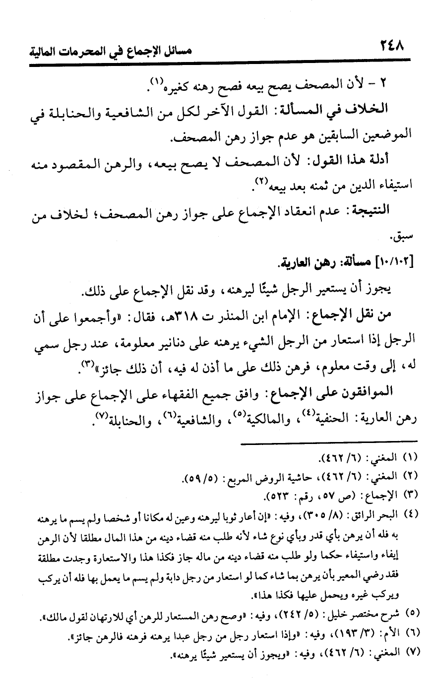 • أدلة هذا القول: لأن المصحف لا يصح بيعه، والرهن المقصود منه استيفاء الدين من ثمنه بعد بيعه (¬2).Rعدم انعقاد الإجماع على جواز رهن المصحف؛ لخلاف من سبق.