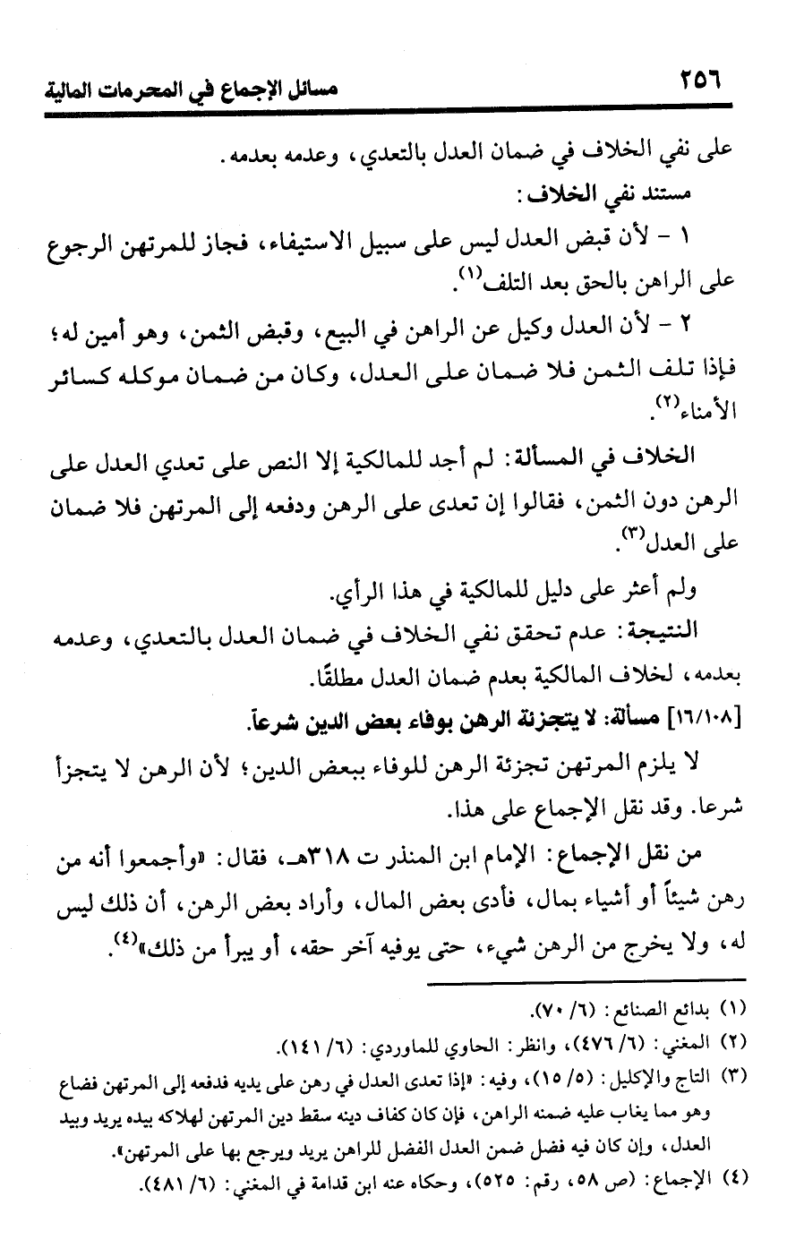 • من نقل الإجماع: الإمام ابن المنذر ت 318 هـ، فقال: "وأجمعوا أنه من رهن شيئًا أو أشياء بمال، فأدى بعض المال، وأراد بعض الرهن، أن ذلك ليس له، ولا يخرج من الرهن شيء، حتى يوفيه آخر حقه، أو يبرأ من ذلك" (¬4).