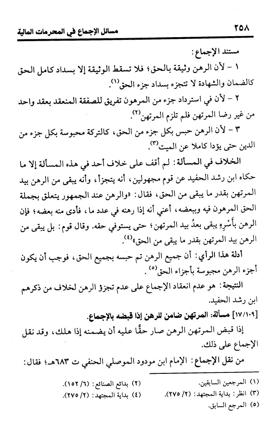 • أدلة هذا الرأي: أن جميع الرهن تم حبسه بجميع الحق، فوجب أن يكون أجزء الرهن محبوسة بأجزاء الحق (¬5).Rهو عدم انعقاد الإجماع على عدم تجزؤ الرهن لخلاف من ذكرهم ابن رشد الحفيد.