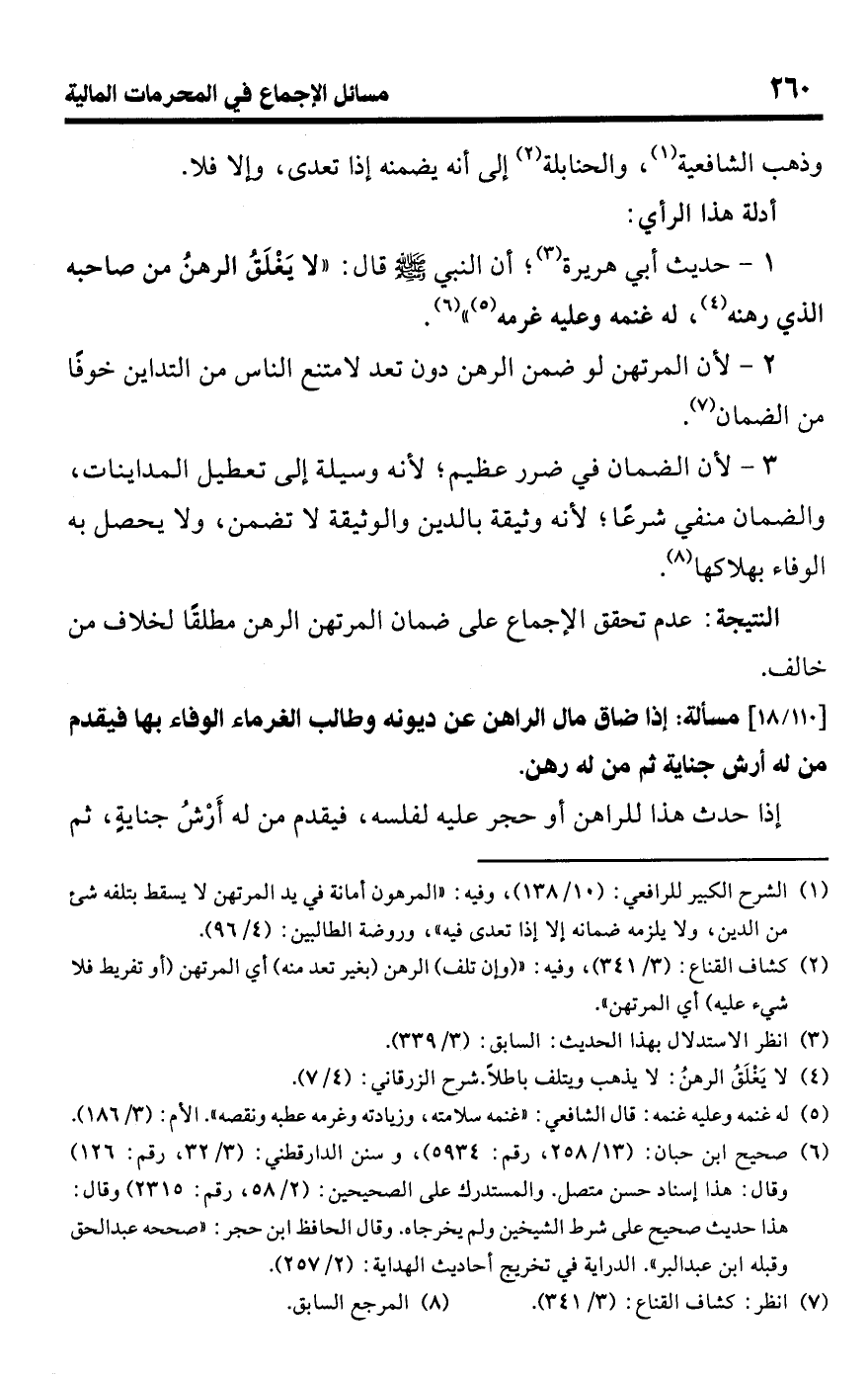 3 - لأن الضمان في ضرر عظيم؛ لأنه وسيلة إلى تعطيل المداينات، والضمان منفي شرعًا؛ لأنه وثيقة بالدين والوثيقة لا تضمن، ولا يحصل به الوفاء بهلاكها (¬8).Rعدم تحقق الإجماع على ضمان المرتهن الرهن مطلقًا لخلاف من خالف.